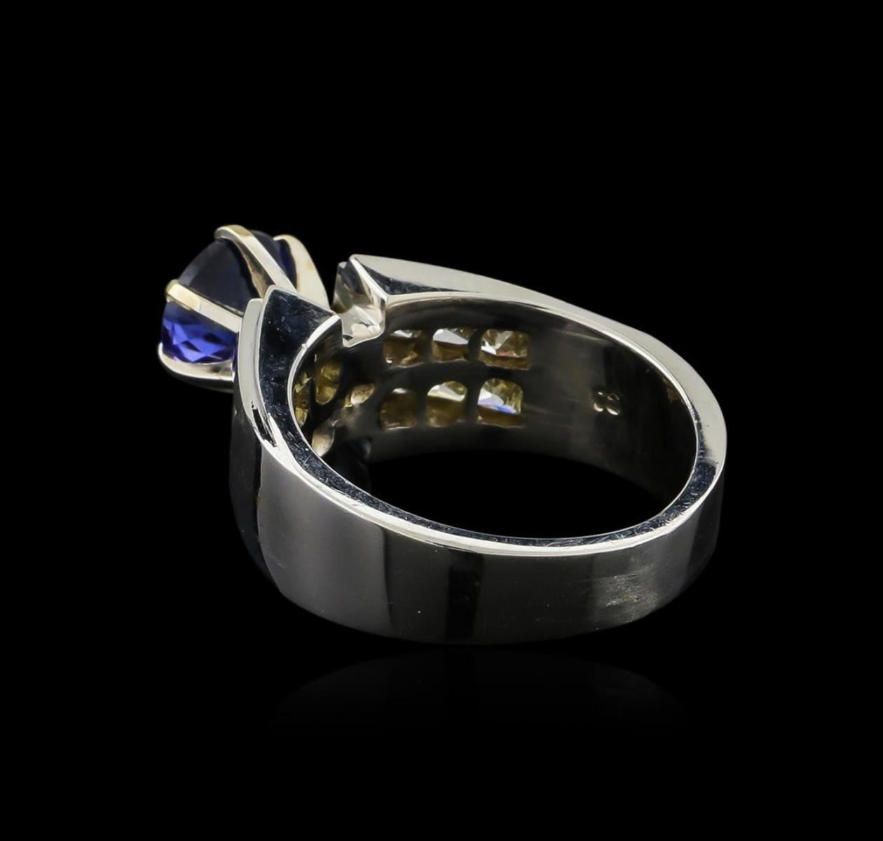 One electronically tested 14KT white gold ladies combination cast & assembled ring with a bright polish finish. Identified with markings of "14K". Condition is new. Containing: One prong set round modified brilliant cut natural tanzanite, measuring 7.38 - 7.32 x 5.26 mm, approximate weight of 1.92ct., clarity is eye clean, type I, medium light, very slightly grayish, violet color, (GIA V 4/3), cut is good. Twelve invisible set princess cut diamonds, measuring 2.50 x 2.30 x 1.73mm (depth est.) approximate total weight of 12 Stones = 0.98ct. Clarity: VS-2. Color: J - K, Cut is Good. Colored gemstones are presumed to have been subjected to commonly used enhancement processes. All diamonds and colored gemstones are graded in the mounting, unless otherwise stated. Total Weight of Colored Stones 1.92ct. Total Weight of Diamonds 0.98ct. Total Weight of Ring 11.20 grams. GGL Appraised.