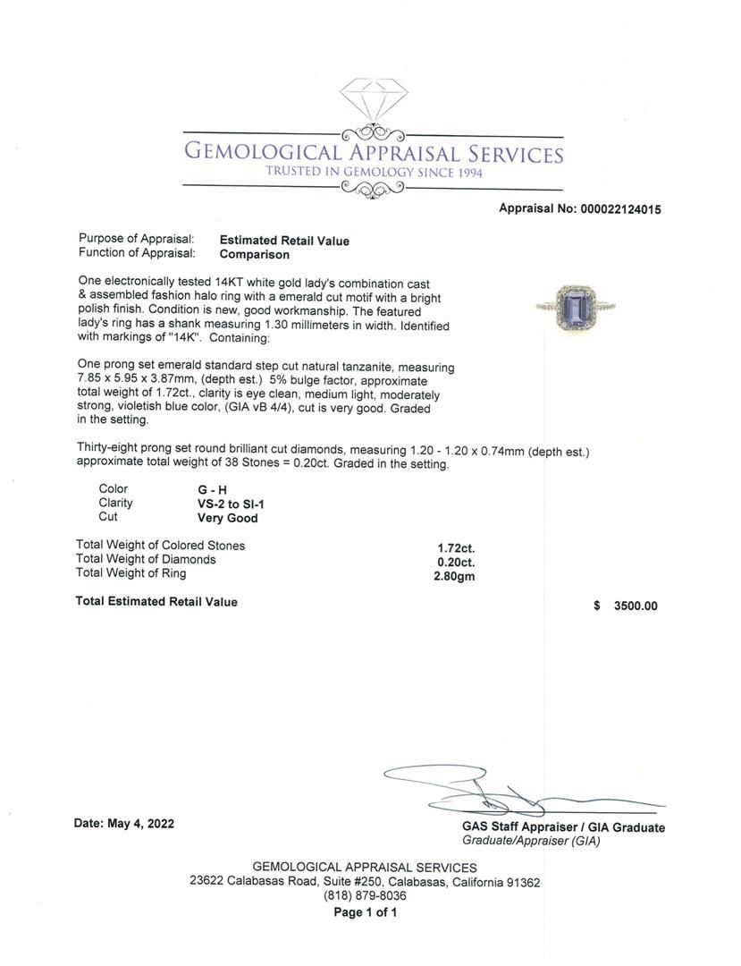 Appraisal No: 000022124015 One electronically tested 14KT white gold lady's combination cast & assembled fashion halo ring with a emerald cut motif with a bright polish finish. Condition is new, good workmanship. The featured lady's ring has a shank mea