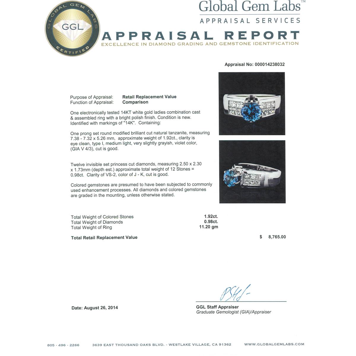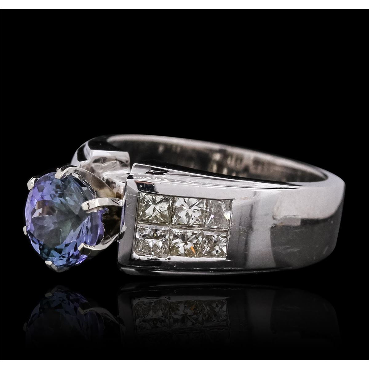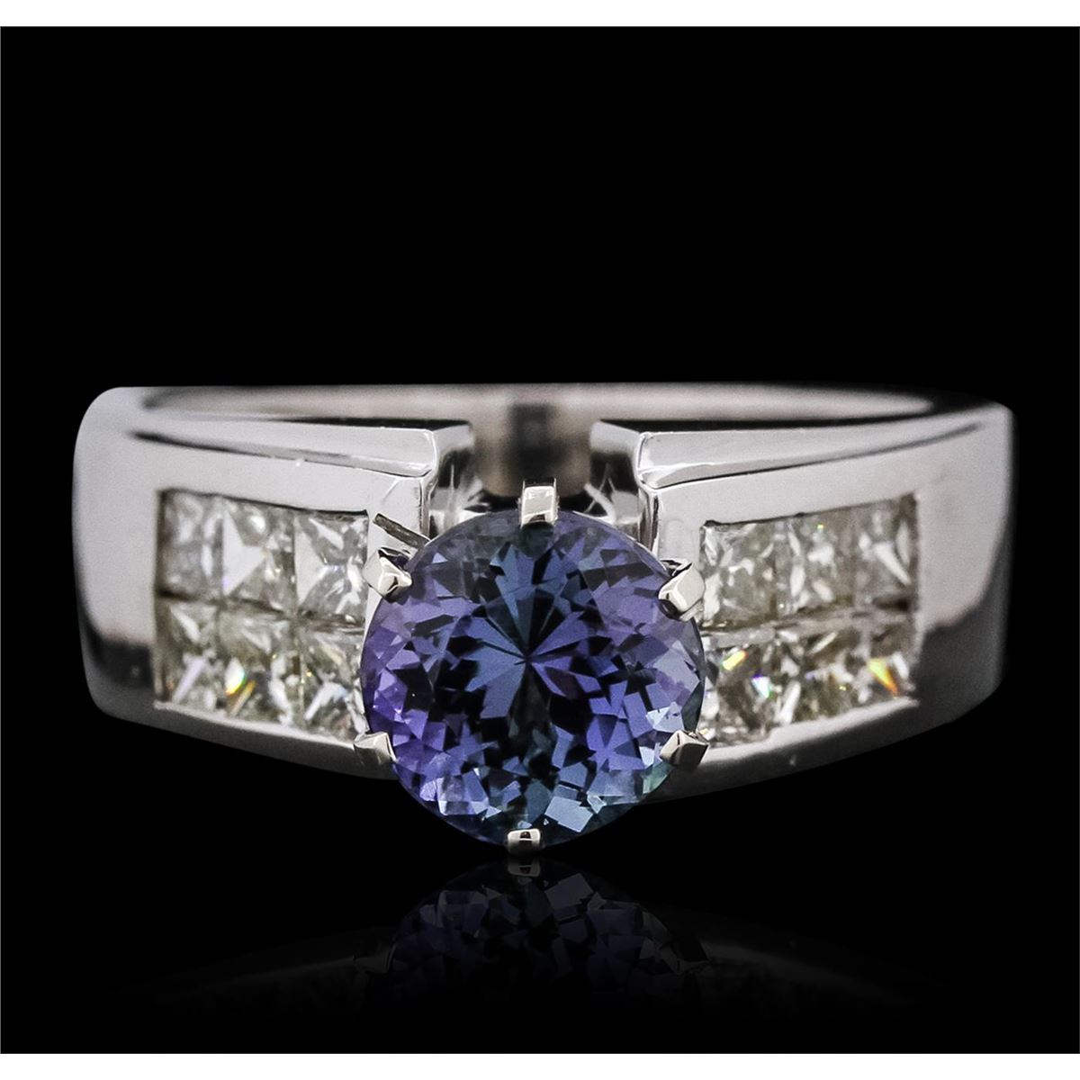 One electronically tested 14KT white gold ladies combination cast & assembled ring with a bright polish finish. Identified with markings of "14K". Condition is new. Containing: One prong set round modified brilliant cut natural tanzanite, measuring 7.38 - 7.32 x 5.26 mm, approximate weight of 1.92ct., clarity is eye clean, type I, medium light, very slightly grayish, violet color, (GIA V 4/3), cut is good. Twelve invisible set princess cut diamonds, measuring 2.50 x 2.30 x 1.73mm (depth est.) approximate total weight of 12 Stones = 0.98ct. Clarity: VS-2. Color: J - K, Cut is Good. Colored gemstones are presumed to have been subjected to commonly used enhancement processes. All diamonds and colored gemstones are graded in the mounting, unless otherwise stated. Total Weight of Colored Stones 1.92ct. Total Weight of Diamonds 0.98ct. Total Weight of Ring 11.20 grams. GGL Appraised at $8,765.00.