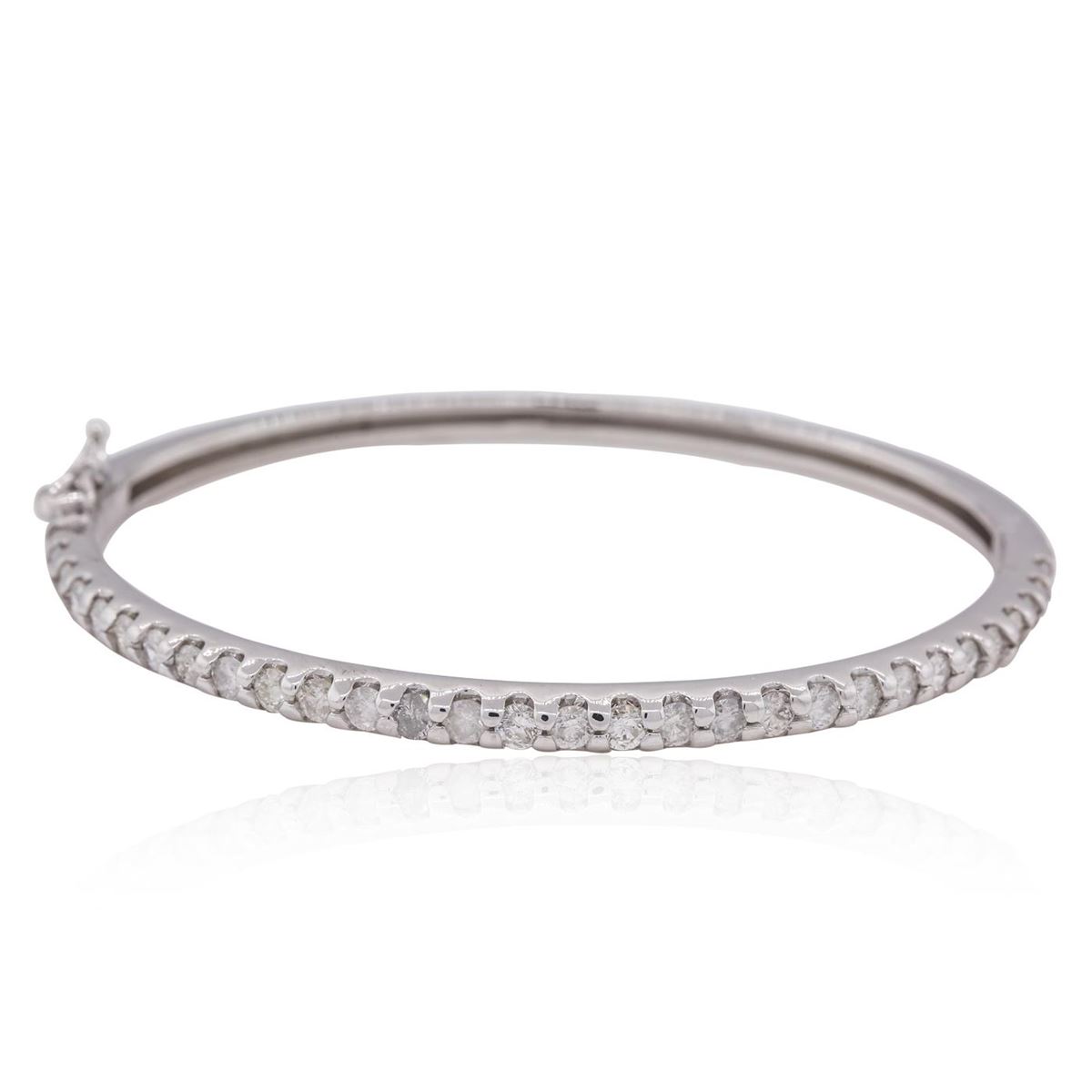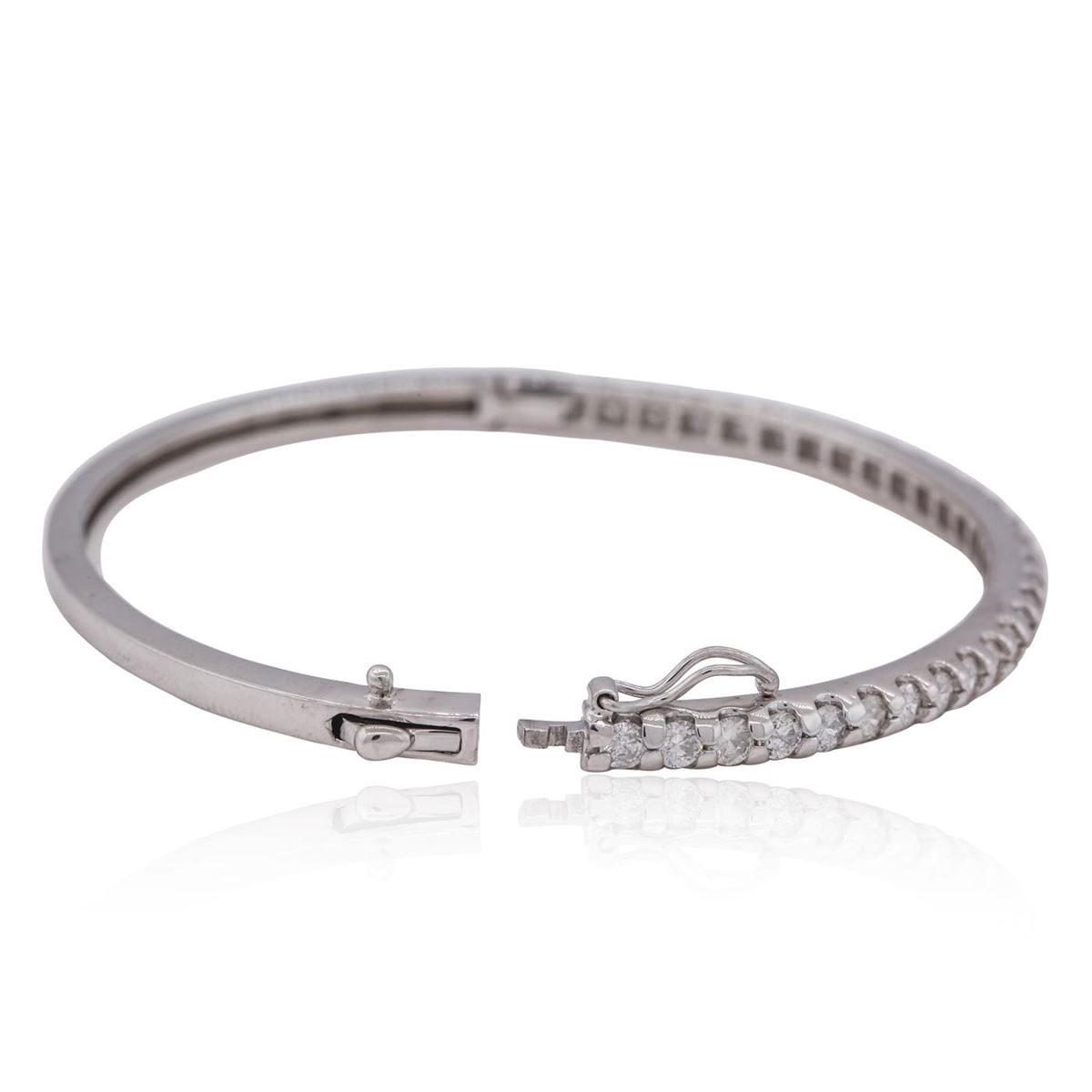 One electronically tested 14KT white gold ladies combination cast & assembled bangle bracelet with a hidden box clasp with safety closer with a bright polish finish. Measurements: 2.50 x 2.00. Condition is new. Containing: Thirty prong set round brilliant cut diamonds, measuring 2.60 - 2.60 x 1.56mm (depth est.) approximate total weight of 30 Stones = 1.93ct. Clarity: SI-2 to I-1. Color: H - I, Cut is Good. All diamonds are graded in the mounting, unless otherwise stated. Total Weight of Diamonds 1.93ct. Total Weight of Bracelet 14.20 grams. GGL Appraised at $7,330.00.