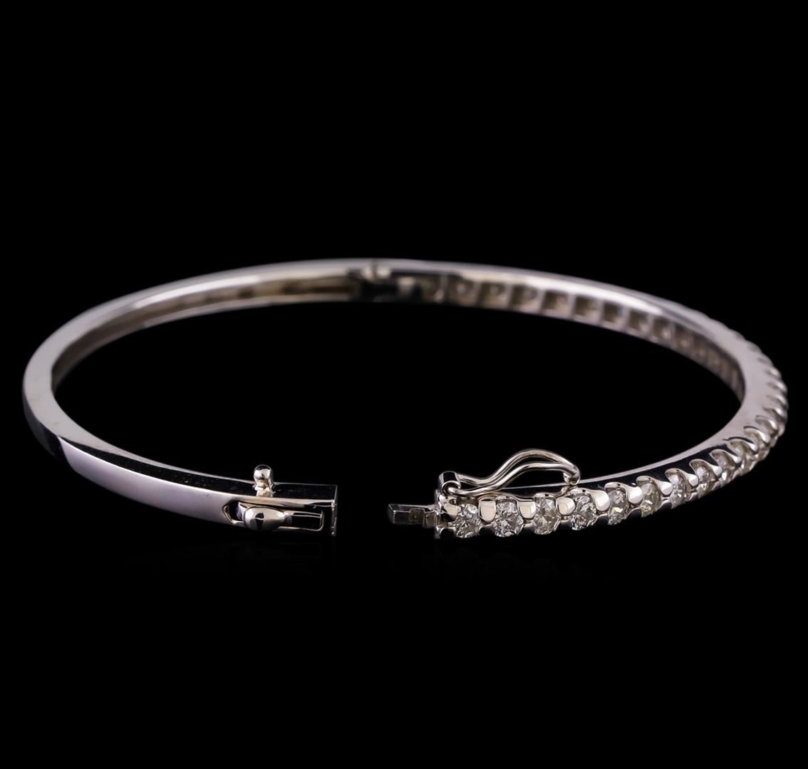 One electronically tested 14KT white gold ladies combination cast & assembled bangle bracelet with a hidden box clasp with safety closer with a bright polish finish. Measurements: 2.50 x 2.00. Condition is new. Containing: Thirty prong set round brilliant cut diamonds, measuring 2.60 - 2.60 x 1.56mm (depth est.) approximate total weight of 30 Stones = 1.93ct. Clarity: SI-2 to I-1. Color: H - I, Cut is Good. All diamonds are graded in the mounting, unless otherwise stated. Total Weight of Diamonds 1.93ct. Total Weight of Bracelet 14.20 grams. GGL Appraised at $7,330.00.