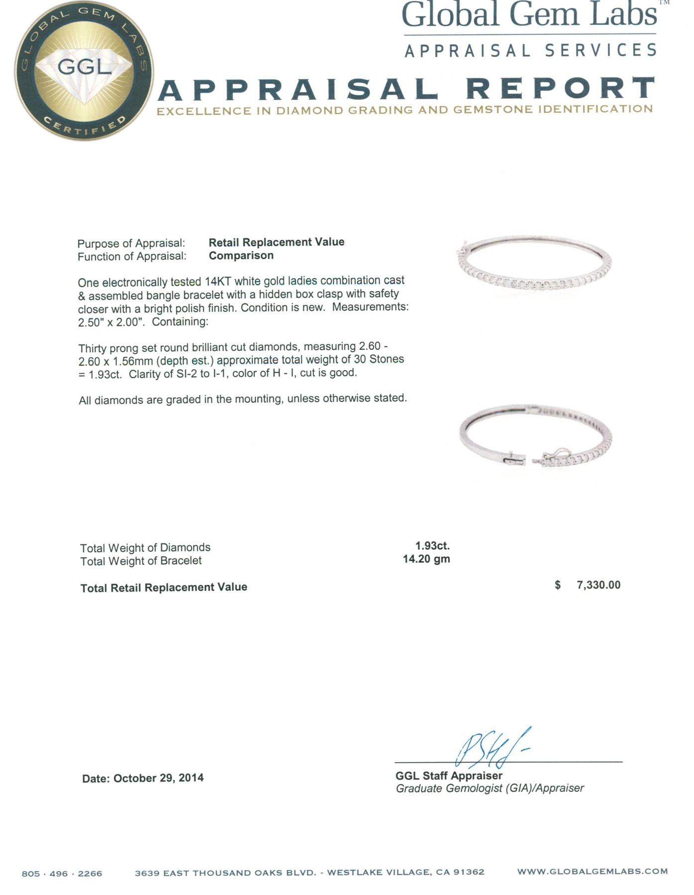 One electronically tested 14KT white gold ladies combination cast & assembled bangle bracelet with a hidden box clasp with safety closer with a bright polish finish. Measurements: 2.50 x 2.00. Condition is new. Containing: Thirty prong set round brilliant cut diamonds, measuring 2.60 - 2.60 x 1.56mm (depth est.) approximate total weight of 30 Stones = 1.93ct. Clarity: SI-2 to I-1. Color: H - I, Cut is Good. All diamonds are graded in the mounting, unless otherwise stated. Total Weight of Diamonds 1.93ct. Total Weight of Bracelet 14.20 grams. GGL Appraised.