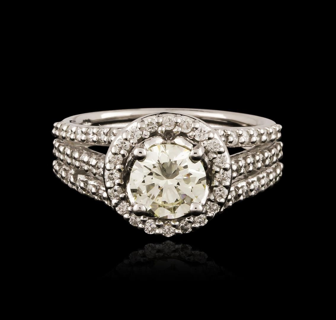 One electronically tested 14KT white gold ladies cast diamond unity ring with a bright polish finish. The featured diamond is set within a diamond bezel supported by diamond set three-way split shoulders, completed by a grooved three millimeter wide band. Identified with markings of "14K". Condition is new, good workmanship. Containing: One prong set round brilliant cut diamond, measuring 6.65 - 6.63 x 4.20mm (depth est.) approximate weight of 1.15ct with a medium strong blue fluorescence. Graded in the setting. Clarity: SI-1. Depth: 63.3%. Table 64.8%. Sixty-Two prong set round brilliant cut diamonds, measuring 1.50 - 1.40 x 0.87mm (depth est.) approximate total weight of 62 Stones = 0.78ct. Graded in the setting. Clarity: SI-2 to I-1. Color: G - I. Total Weight of Diamonds 1.93ct. Total Weight of Ring 7.05 grams. AIG Appraised at $13,545.00.