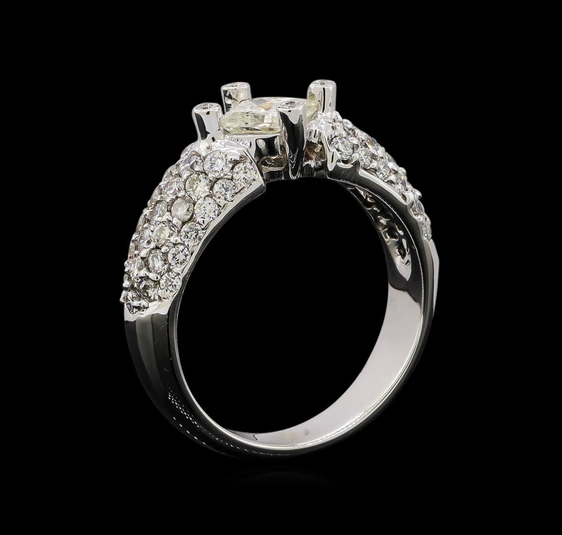 One electronically tested 14KT white gold ladies cast diamond engagement ring. Identified with markings of "14K". Condition is new. Containing: One prong set princess cut diamond, measuring 5.50 x 4.60 x 3.45mm (depth est.) approximate weight of 0.80ct. Clarity: I-2. Color: K, Cut is Good. Four bezel set round brilliant cut diamonds, measuring 1.10 - 1.10 x 0.66mm (depth est.) approximate total weight of 4 Stones = 0.03ct. Clarity: SI-1. Color: I, Cut is Good. Sixty prong set round brilliant cut diamonds, measuring 1.50 - 1.30 x 0.84mm (depth est.) approximate total weight of 60 Stones = 1.10ct. Clarity: SI-1 to SI-2. Color: I, Cut is Good. Diamonds are graded in the mounting, unless otherwise stated. Total Weight of Diamonds 1.93ct. Total Weight of Engagement Ring 6.00 grams. GGL Appraised at $4,925.00.