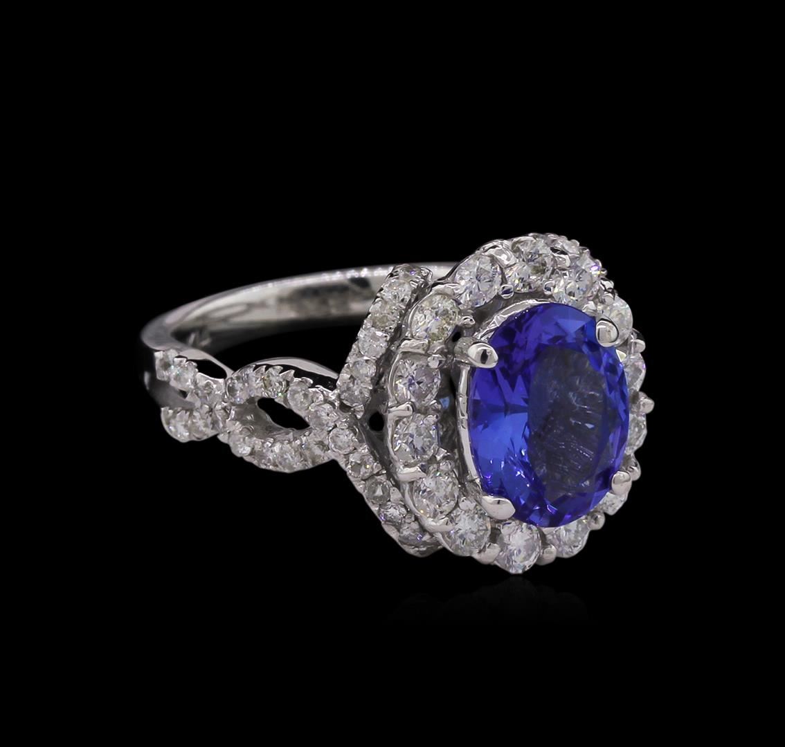 One electronically tested 14KT white gold Ladies combination cast & assembled ring with a bright polish finish. Condition is new. Identified with markings of "K14". Containing: One prong set oval modified brilliant cut natural tanzanite, measuring 9.50 x 7.80 x 3.84mm, approximate weight of 1.93ct., clarity is eye clean, type I, medium, moderately strong, bluish violet color, (GIA bV 5/4), cut is good. Colored gemstones are presumed to have been subjected to commonly used color/clarity enhancement processes. Sixty-Five prong set round brilliant cut diamonds, measuring 1.30 - 1.30 x 0.78mm (depth est.) approximate. Total Weight of 65 Stones = 0.52ct. Clarity: I-1 to I-2. Color: I - J, Cut is Good. Fourteen prong set round brilliant cut diamonds, measuring 2.50 - 2.50 x 1.50mm (depth est.) approximate. Total Weight of 14 Stones = 0.80ct. Clarity: SI-2 to I-1. Color: I - J, Cut is Good. Total Weight of Colored Stones 1.93ct. Total Weight of Diamonds 1.32ct. Total Weight of Ring 7.00 grams. GGL Appraised at $8,555.00.