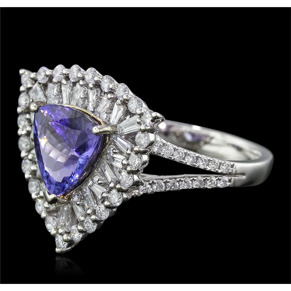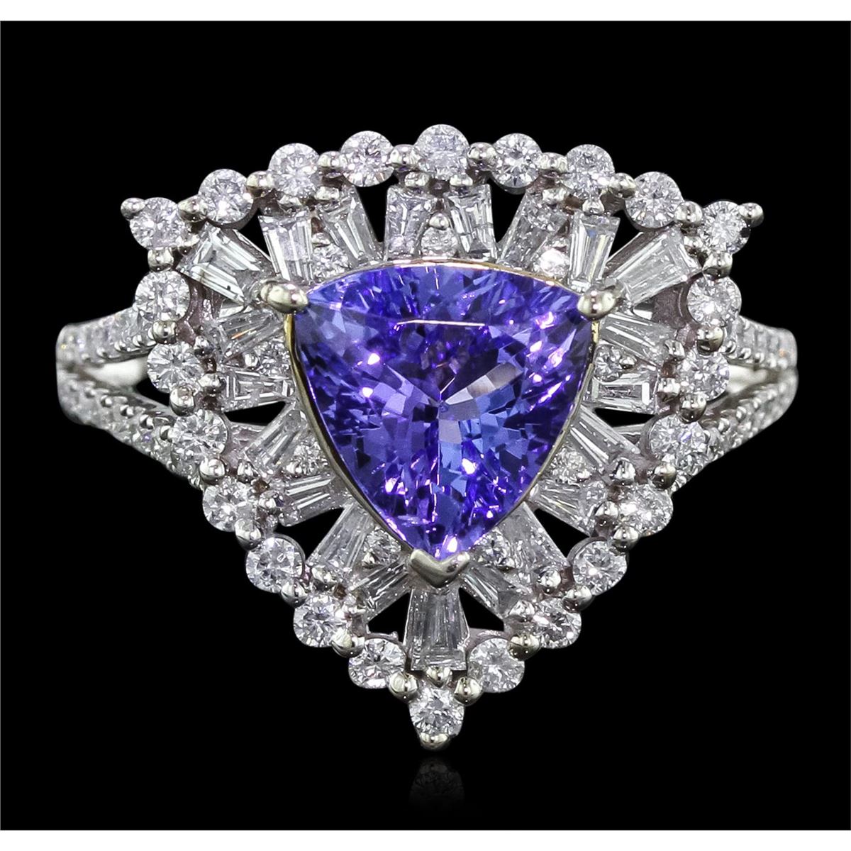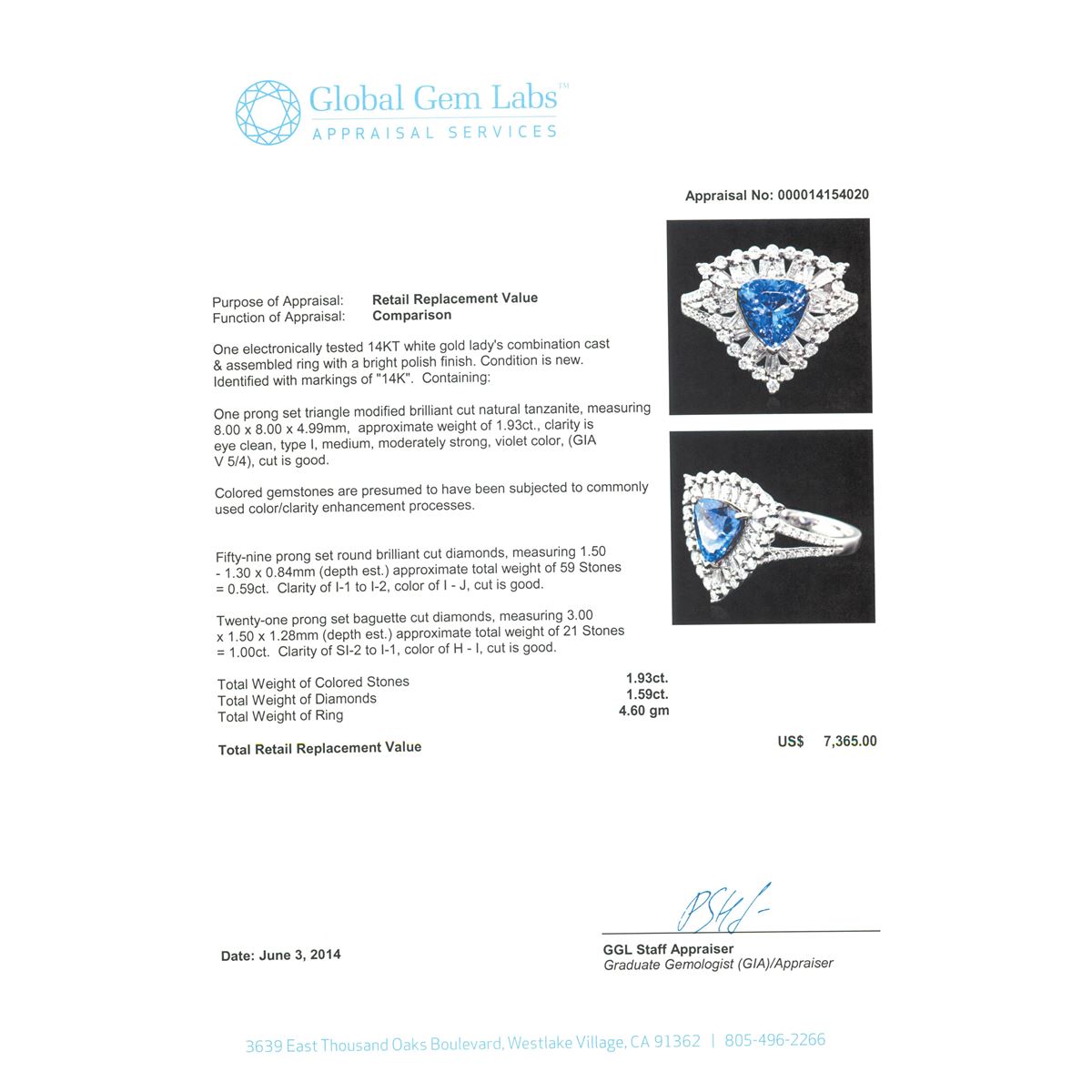 One electronically tested 14KT white gold Ladies combination cast & assembled ring with a bright polish finish. Condition is new. Identified with markings of "14K". Containing: One prong set triangle modified brilliant cut natural tanzanite, measuring 8.00 x 8.00 x 4.99mm, approximate weight of 1.93ct., clarity is eye clean, type I, medium, moderately strong, violet color, (GIA V 5/4), cut is good. Colored gemstones are presumed to have been subjected to commonly used color/clarity enhancement processes. Fifty-Nine prong set round brilliant cut diamonds, measuring 1.50 - 1.30 x 0.84mm (depth est.) approximate. Total Weight of 59 Stones = 0.59ct. Clarity: I-1 to I-2. Color: I - J, Cut is Good. Twenty-One prong set baguette cut diamonds, measuring 3.00 x 1.50 x 1.28mm (depth est.) approximate. Total Weight of 21 Stones = 1.00ct. Clarity: SI-2 to I-1. Color: H - I, Cut is Good. Total Weight of Colored Stones 1.93ct. Total Weight of Diamonds 1.59ct. Total Weight of Ring 4.60 grams. GGL Appraised at $7,365.00.