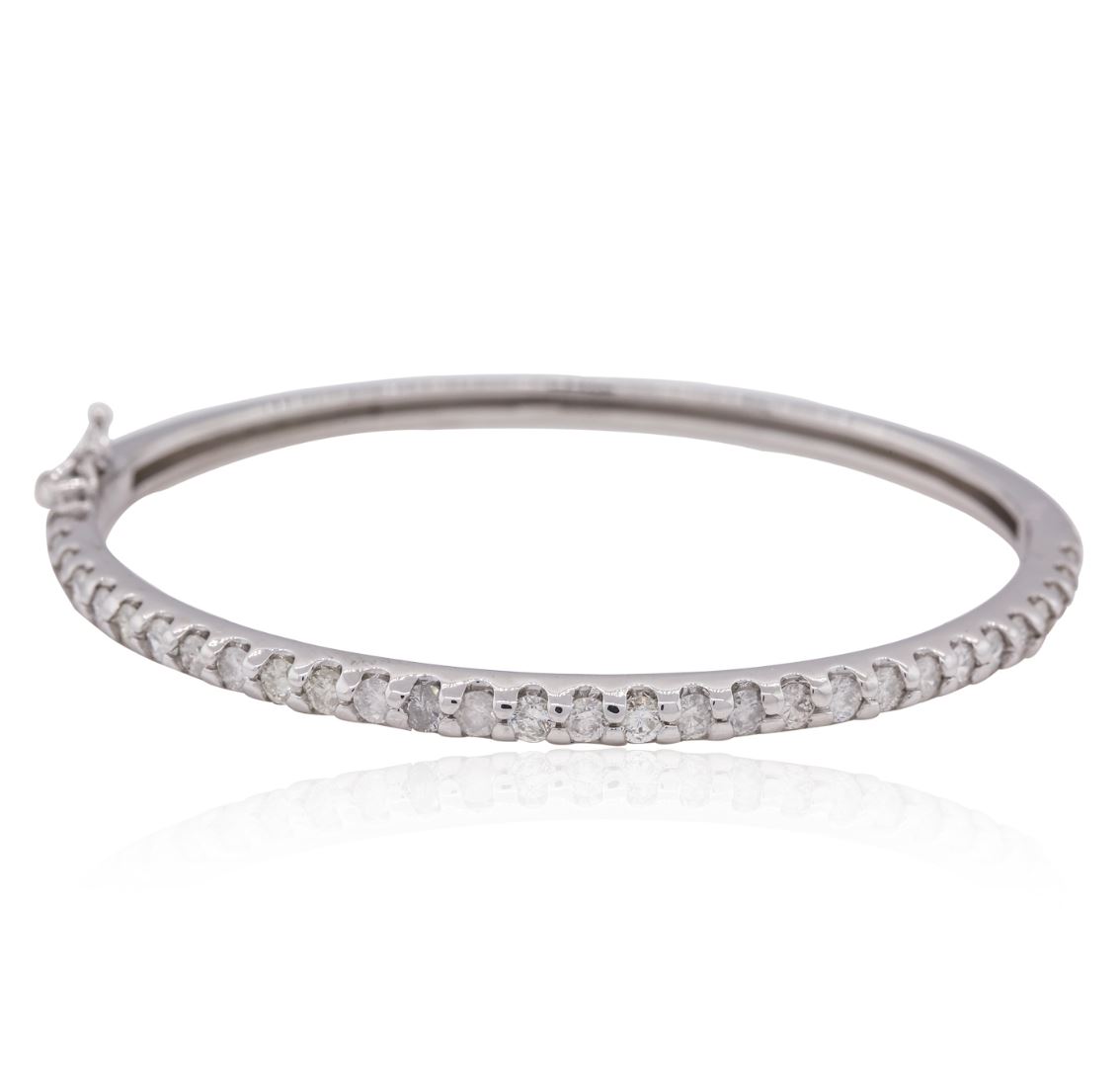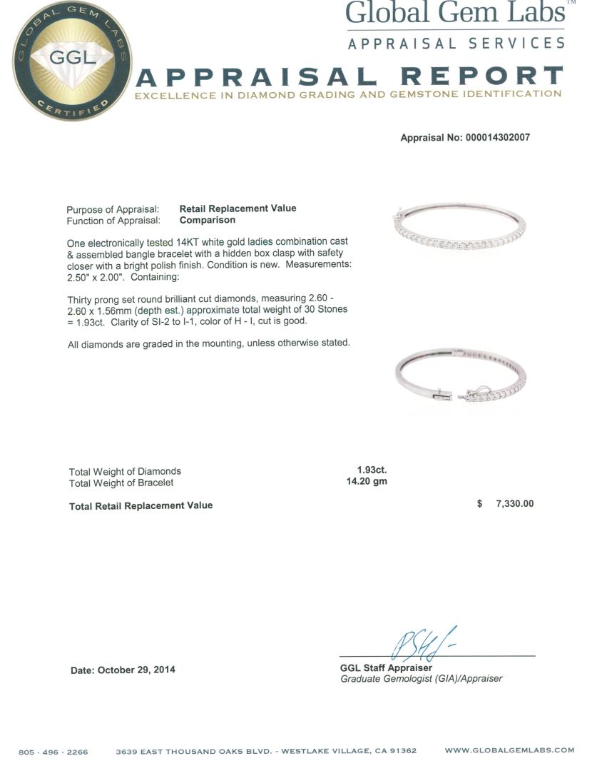 One electronically tested 14KT white gold ladies combination cast & assembled bangle bracelet with a hidden box clasp with safety closer with a bright polish finish. Measurements: 2.50 x 2.00. Condition is new. Containing: Thirty prong set round brilliant cut diamonds, measuring 2.60 - 2.60 x 1.56mm (depth est.) approximate total weight of 30 Stones = 1.93ct. Clarity: SI-2 to I-1. Color: H - I, Cut is Good. All diamonds are graded in the mounting, unless otherwise stated. Total Weight of Diamonds 1.93ct. Total Weight of Bracelet 14.20 grams. GGL Appraised at $7,330.00.