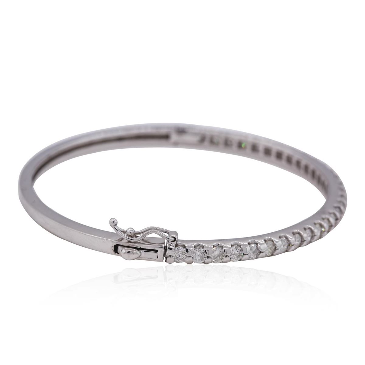 One electronically tested 14KT white gold ladies combination cast & assembled bangle bracelet with a hidden box clasp with safety closer with a bright polish finish. Measurements: 2.50 x 2.00. Condition is new. Containing: Thirty prong set round brilliant cut diamonds, measuring 2.60 - 2.60 x 1.56mm (depth est.) approximate total weight of 30 Stones = 1.93ct. Clarity: SI-2 to I-1. Color: H - I, Cut is Good. All diamonds are graded in the mounting, unless otherwise stated. Total Weight of Diamonds 1.93ct. Total Weight of Bracelet 14.20 grams. GGL Appraised at $7,330.00.