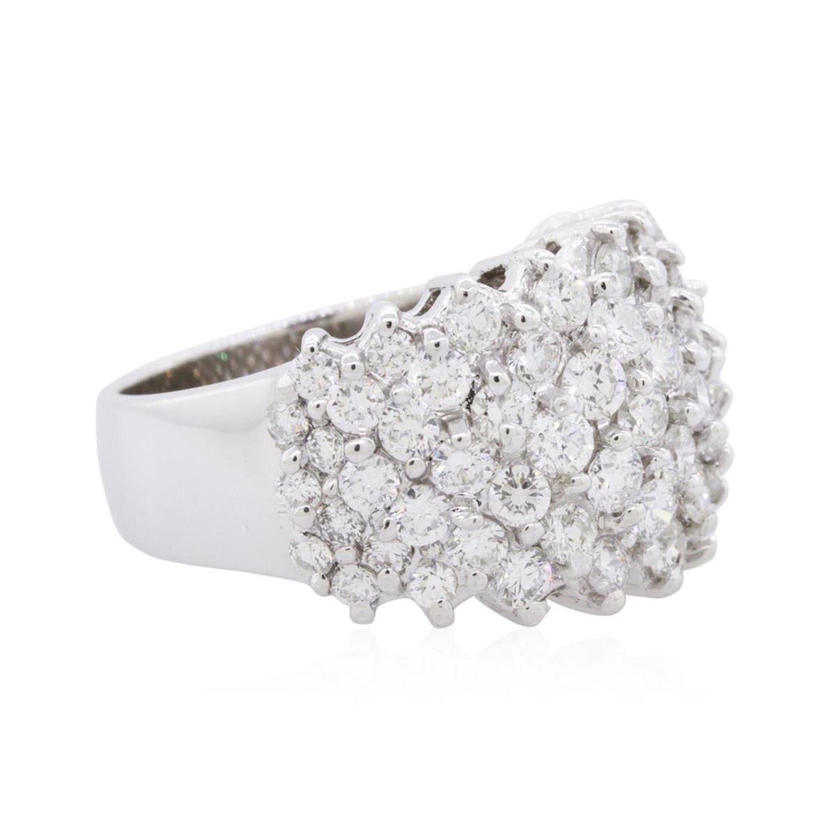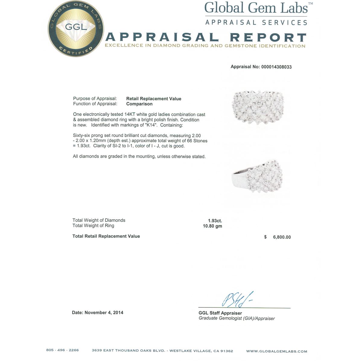 One electronically tested 14KT white gold ladies combination cast & assembled diamond ring with a bright polish finish. Identified with markings of "K14". Condition is new. Containing: Sixty-Six prong set round brilliant cut diamonds, measuring 2.00 - 2.00 x 1.20mm (depth est.) approximate total weight of 66 Stones = 1.93ct. Clarity: SI-2 to I-1. Color: I - J, Cut is Good. All diamonds are graded in the mounting, unless otherwise stated. Total Weight of Diamonds 1.93ct. Total Weight of Ring 10.80 grams. GGL Appraised at $6,800.00.