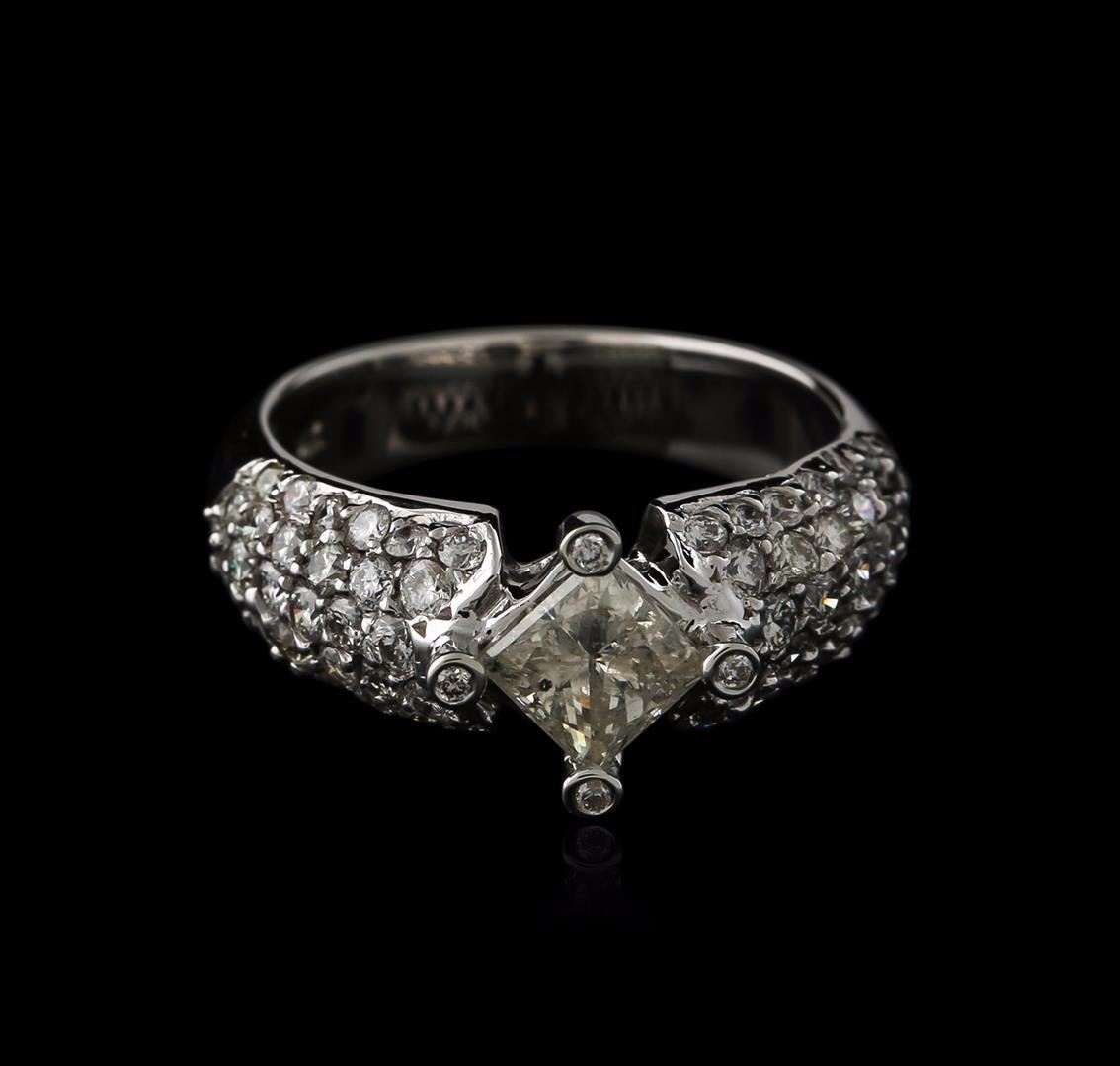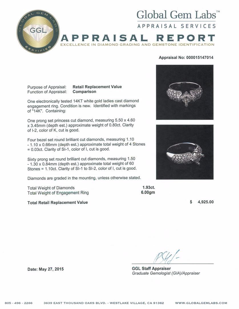 One electronically tested 14KT white gold ladies cast diamond engagement ring. Identified with markings of "14K". Condition is new. Containing: One prong set princess cut diamond, measuring 5.50 x 4.60 x 3.45mm (depth est.) approximate weight of 0.80ct. Clarity: I-2. Color: K, Cut is Good. Four bezel set round brilliant cut diamonds, measuring 1.10 - 1.10 x 0.66mm (depth est.) approximate total weight of 4 Stones = 0.03ct. Clarity: SI-1. Color: I, Cut is Good. Sixty prong set round brilliant cut diamonds, measuring 1.50 - 1.30 x 0.84mm (depth est.) approximate total weight of 60 Stones = 1.10ct. Clarity: SI-1 to SI-2. Color: I, Cut is Good. Diamonds are graded in the mounting, unless otherwise stated. Total Weight of Diamonds 1.93ct. Total Weight of Engagement Ring 6.00 grams. GGL Appraised at $4,925.00.