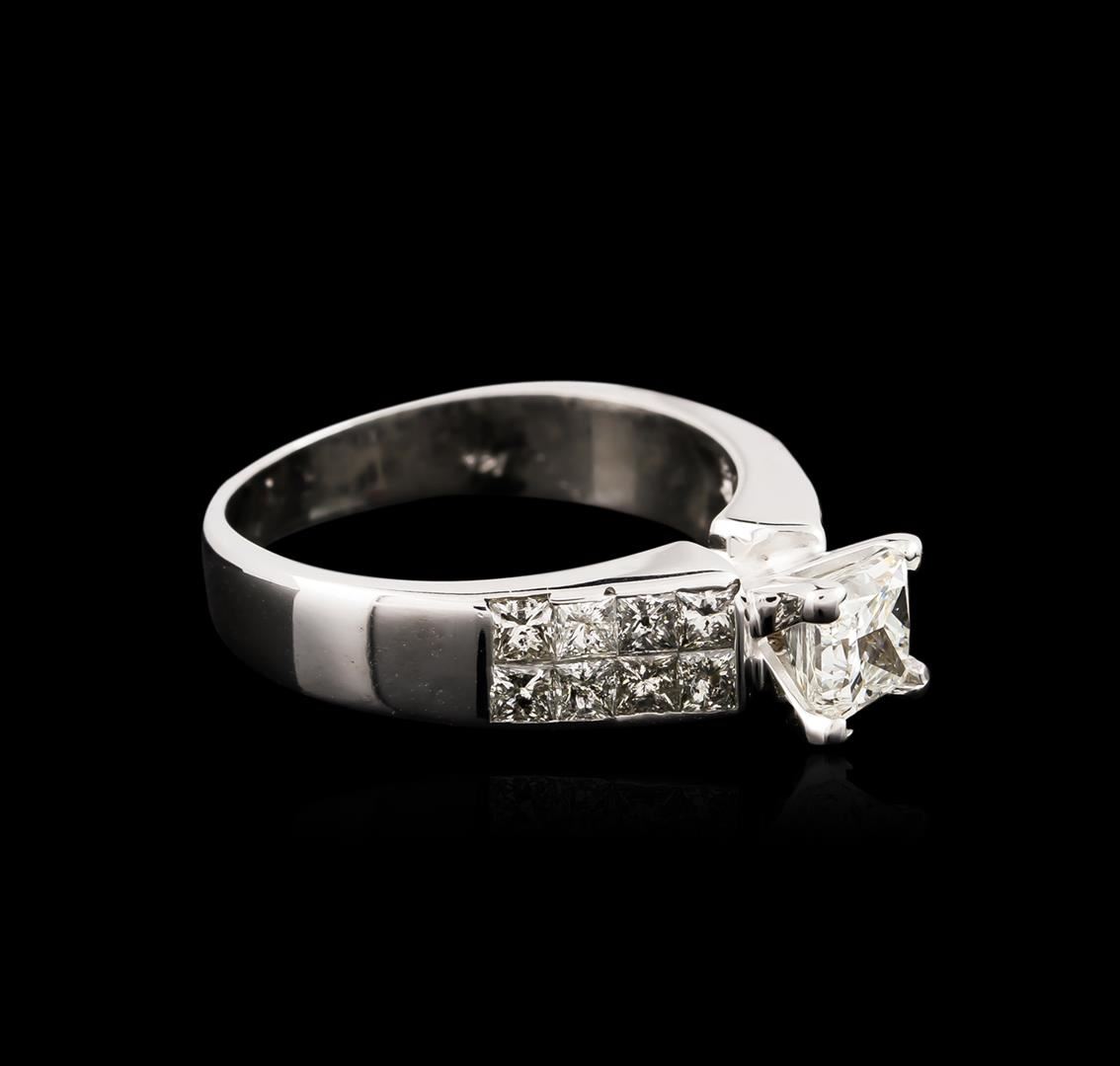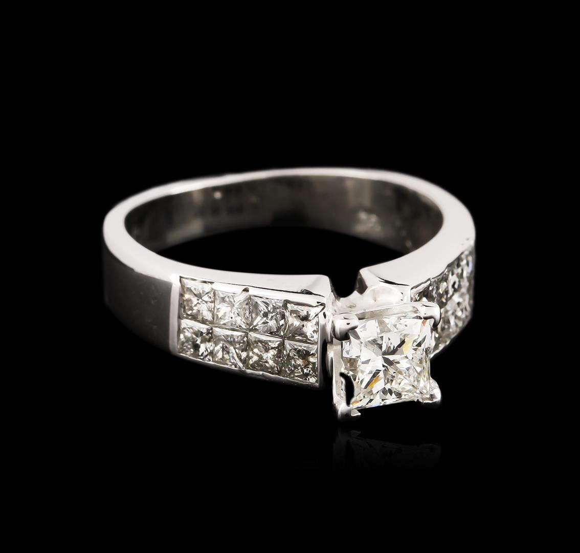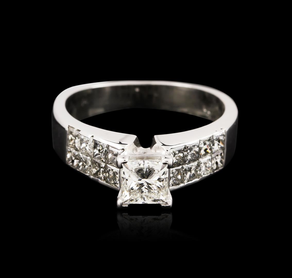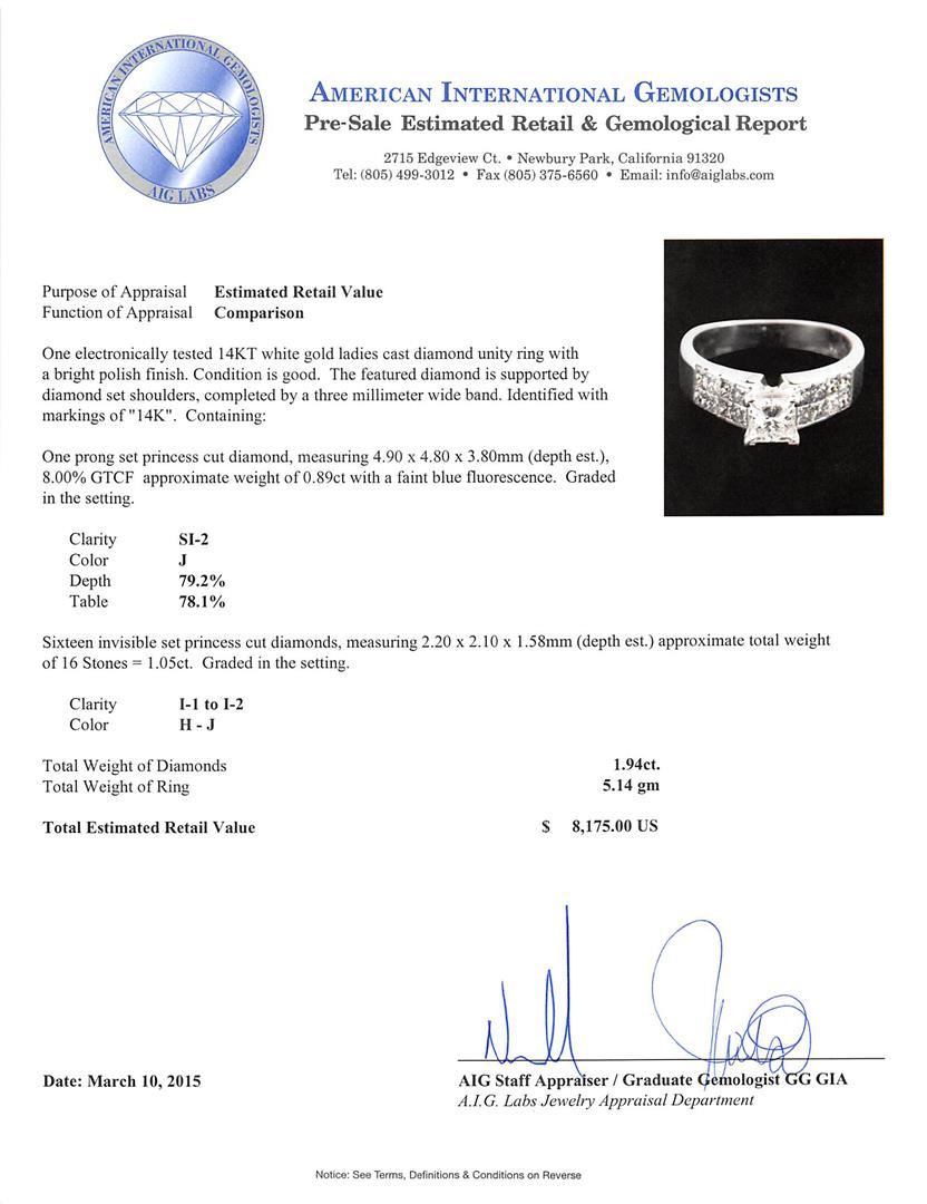 One electronically tested 14KT white gold ladies cast diamond unity ring with a bright polish finish. The featured diamond is supported by diamond set shoulders, completed by a three millimeter wide band. Identified with markings of "14K". Condition is good. Containing: One prong set princess cut diamond, measuring 4.90 x 4.80 x 3.80mm (depth est.), 8.00.%. GTCF approximate weight of 0.89ct with a faint blue fluorescence. Graded in the setting. Clarity: SI-2. Color: 79.2%. Table 78.1%. Sixteen invisible set princess cut diamonds, measuring 2.20 x 2.10 x 1.58mm (depth est.) approximate total weight of 16 Stones = 1.05ct. Graded in the setting. Clarity: I-1 to I-2. Color: H - J. Total Weight of Diamonds 1.94ct. Total Weight of Ring 5.14 grams. AIG Appraised at $8,175.00.