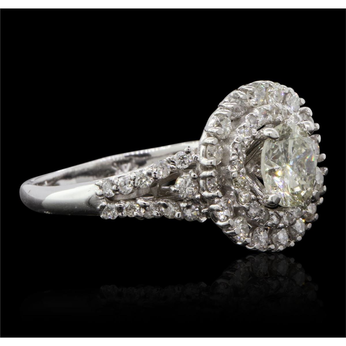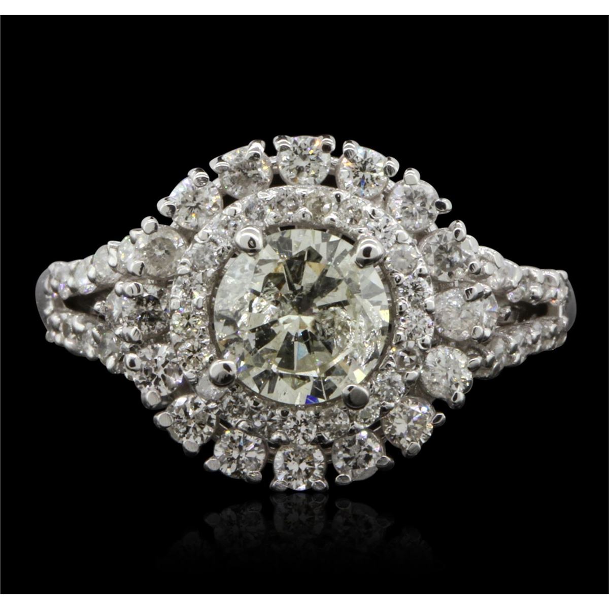 One electronically tested 14KT white gold Ladies combination cast & assembled engagement ring with a antiqued finish. Condition is new. Identified with markings of "14K". Containing: One prong set round brilliant cut diamond, measuring 6.40 - 6.40 x 4.00mm (depth est.) approximate weight of 1.02ct. Clarity of I-2, Color of M, Cut is Very Good. Fifty-Nine bead set round brilliant cut diamonds, measuring 1.80 - 1.10 x 0.87mm (depth est.) approximate total weight of 59 Stones = 0.92ct. Clarity of I-1 to I-2, Color of G - H, Cut is Good. Total Weight of Diamonds 1.94ct. Total Weight of Ring 4.10gm. GGL Appraised at $12,310.00.