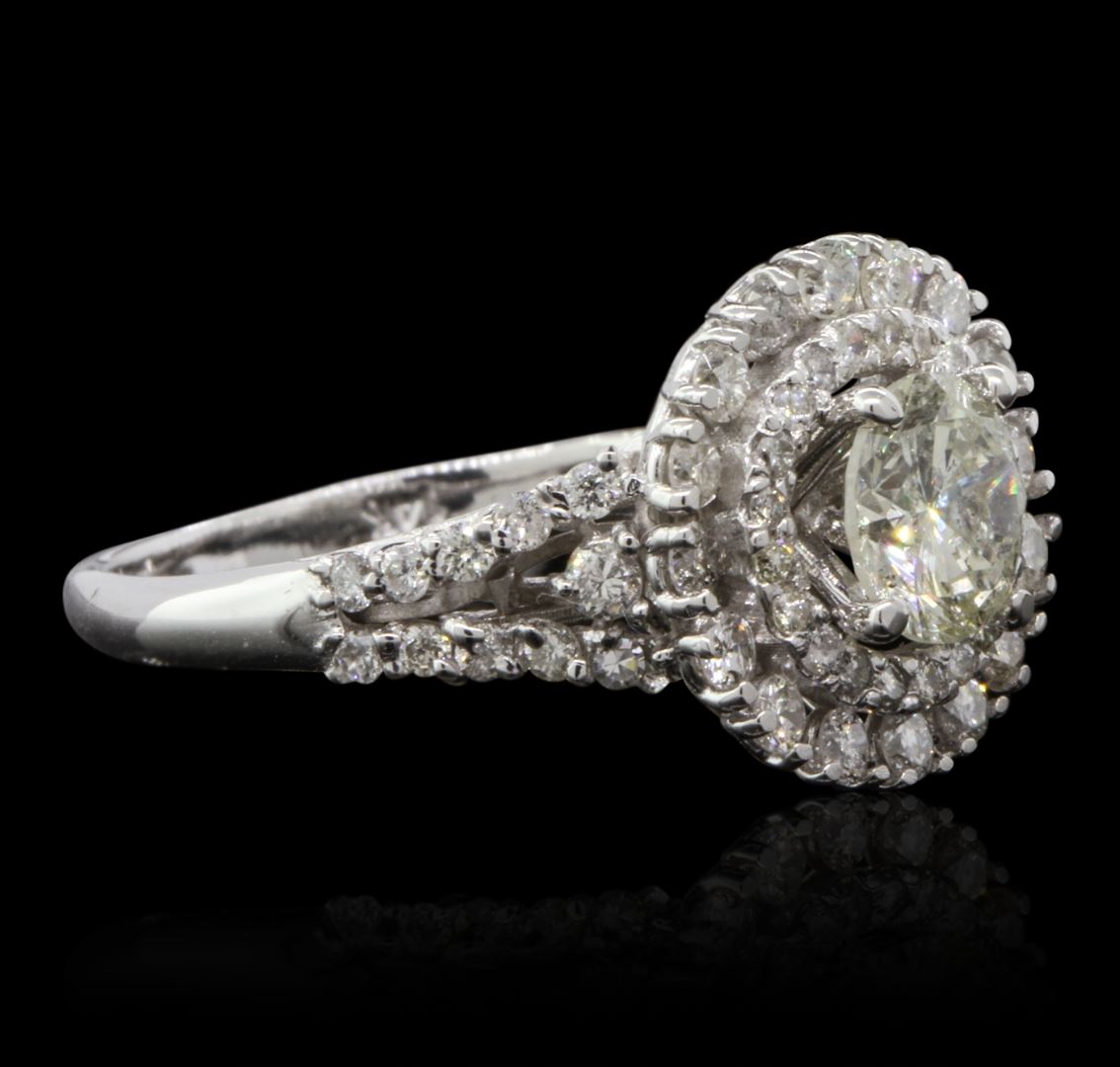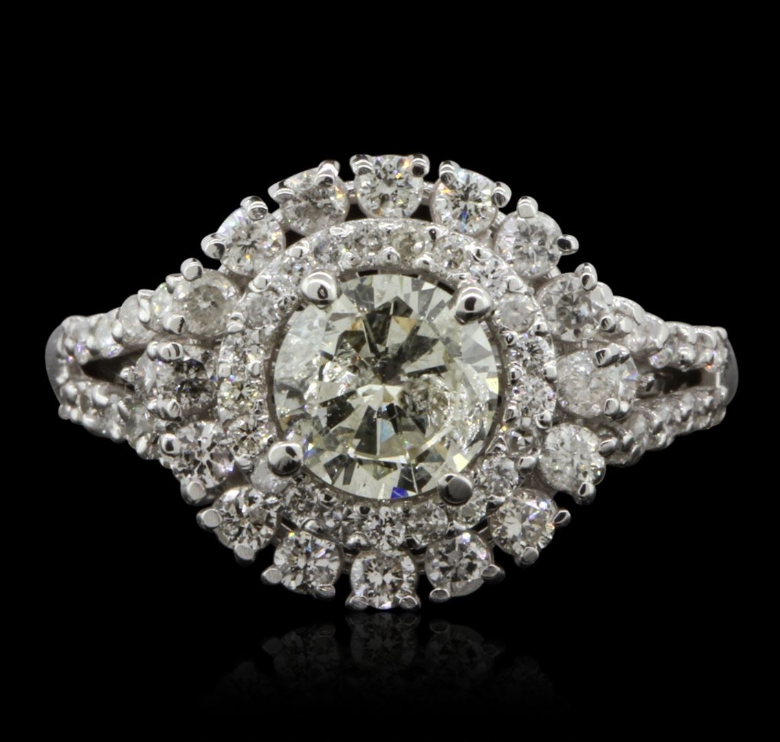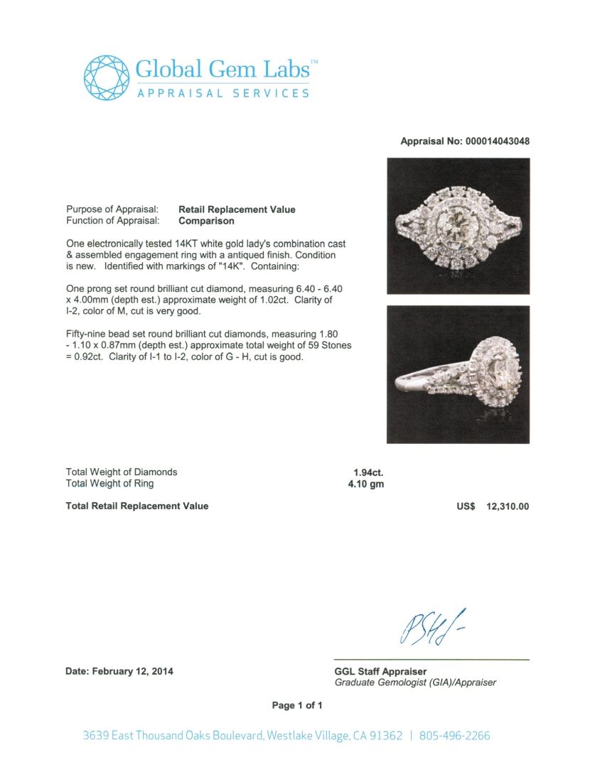 One electronically tested 14KT white gold Ladies combination cast & assembled engagement ring with a antiqued finish. Condition is new. Identified with markings of "14K". Containing: One prong set round brilliant cut diamond, measuring 6.40 - 6.40 x 4.00mm (depth est.) approximate weight of 1.02ct. Clarity of I-2, Color of M, Cut is Very Good. Fifty-Nine bead set round brilliant cut diamonds, measuring 1.80 - 1.10 x 0.87mm (depth est.) approximate total weight of 59 Stones = 0.92ct. Clarity of I-1 to I-2, Color of G - H, Cut is Good. Total Weight of Diamonds 1.94ct. Total Weight of Ring 4.10gm. GGL Appraised at $12,310.00.