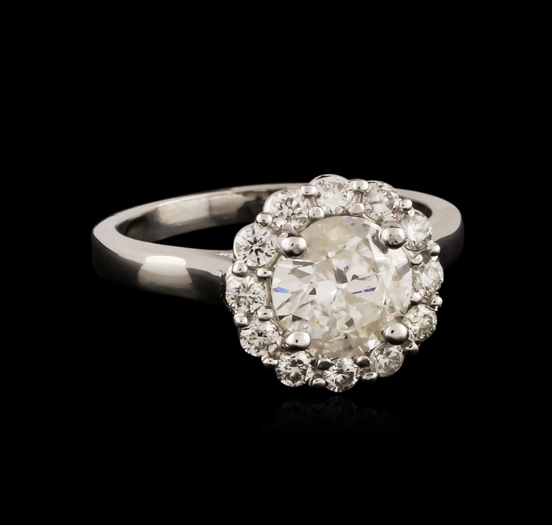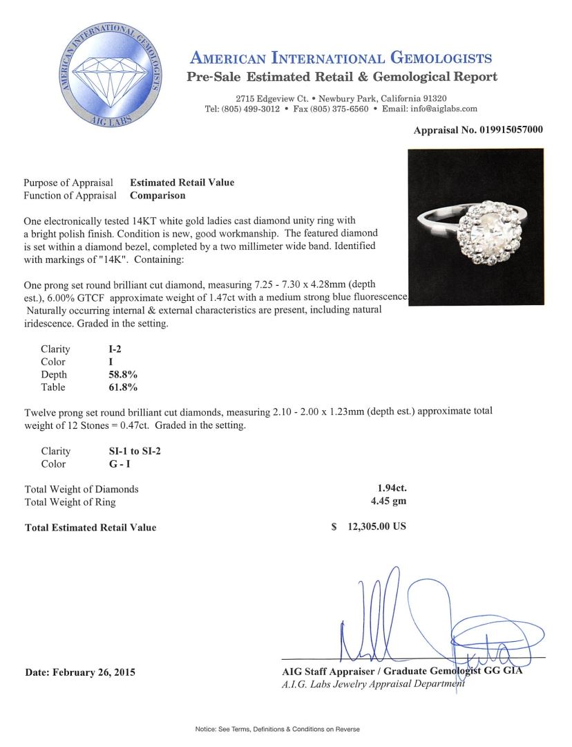 One electronically tested 14KT white gold ladies cast diamond unity ring with a bright polish finish. The featured diamond is set within a diamond bezel, completed by a two millimeter wide band. Identified with markings of "14K". Condition is new, good workmanship. Containing: One prong set round brilliant cut diamond, measuring 7.25 - 7.30 x 4.28mm (depth est.), 6.00.% GTCF approximate weight of 1.47ct with a medium strong blue fluorescence. Naturally occurring internal & external characteristics are present, including natural iridescence. Graded in the setting. Clarity: I-2. Color: I. Depth 58.8%. Table 61.8%. Twelve prong set round brilliant cut diamonds, measuring 2.10 - 2.00 x 1.23mm (depth est.) approximate total weight of 12 Stones = 0.47ct. Graded in the setting. Clarity: SI-1 to SI-2. Color: G - I. Total Weight of Diamonds 1.94ct. Total Weight of Ring 4.45 grams. AIG Appraised at $12,305.00.