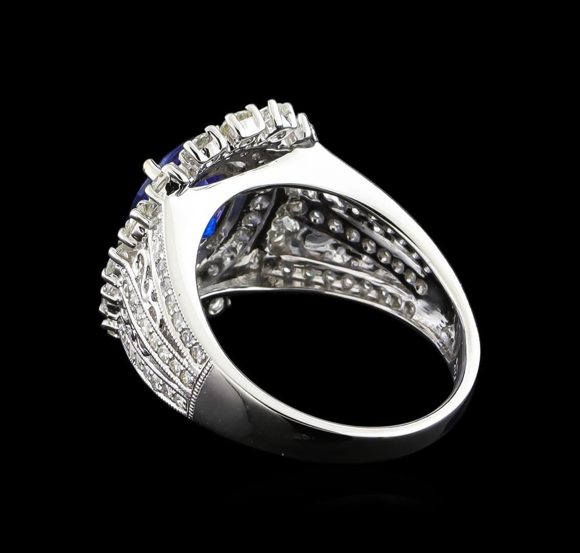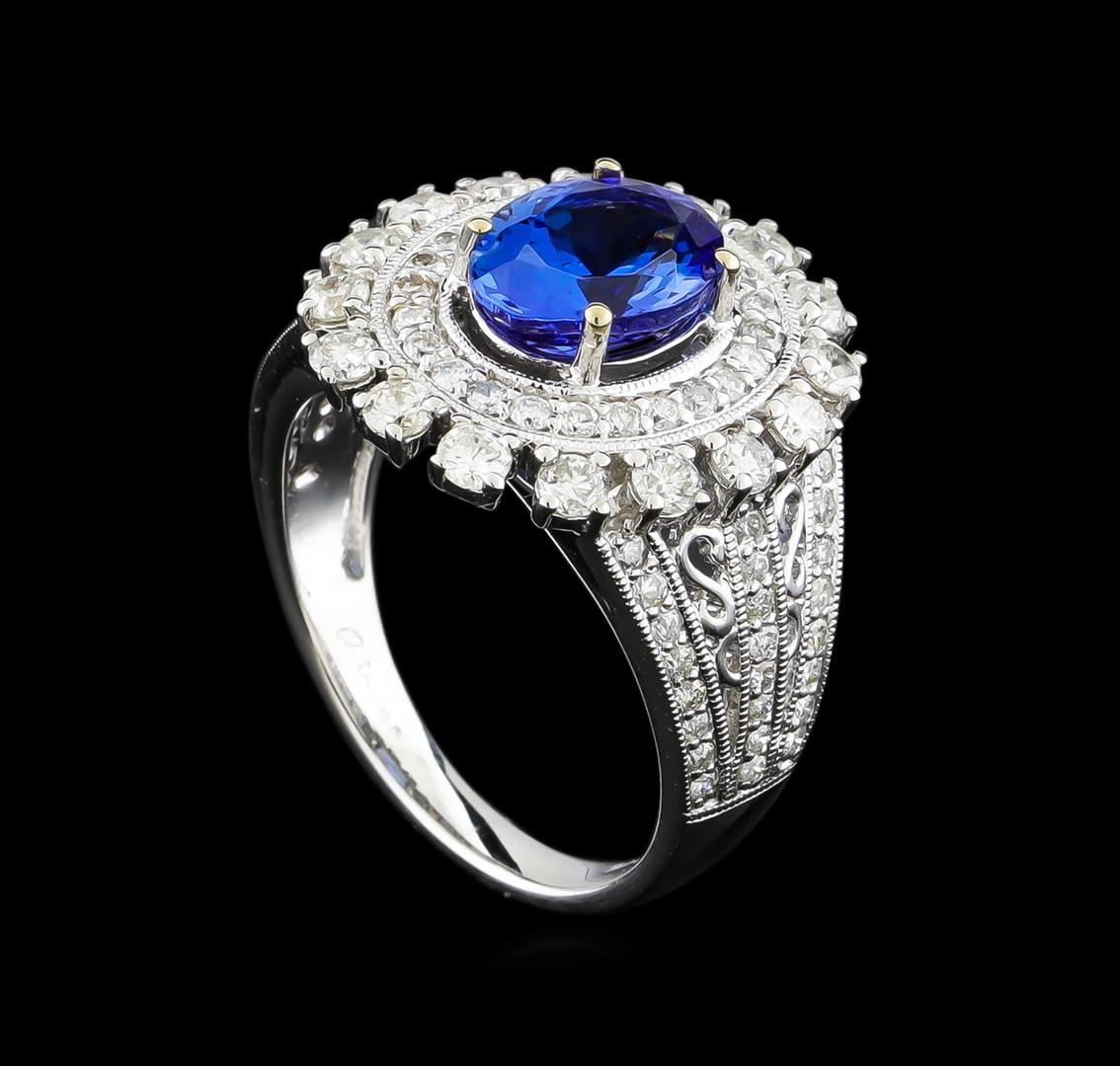 One electronically tested 14KT white gold ladies combination cast & assembled tanzanite and diamond ring with a split shank with a bright polish finish. Identified with markings of "14K". Condition is new. Containing: One prong set oval modified brilliant cut natural tanzanite, measuring 8.91 x 6.92 x 4.65mm, approximate weight of 1.95ct., clarity is eye clean, type I, medium, moderately strong, violet color, (GIA V 5/4), cut is good. Sixteen prong set round brilliant cut diamonds, measuring 2.10 - 2.10 x 1.26mm (depth est.) approximate total weight of 16 Stones = 0.54ct. Clarity: SI-1 to SI-2. Color: I - J, Cut is Good. Seventy-Two prong set round brilliant cut diamonds, measuring 1.10 - 1.10 x 0.66mm (depth est.) approximate total weight of 72 Stones = 0.35ct. Clarity: SI-2 to I-2. Color: I - J, Cut is Good. Colored gemstones are presumed to have been subjected to commonly used enhancement processes. All diamonds and colored gemstones are graded in the mounting, unless otherwise stated. Total Weight of Colored Stones 1.95ct. Total Weight of Diamonds 0.89ct. Total Weight of Ring 5.80 grams. GGL Appraised at $6,975.00.