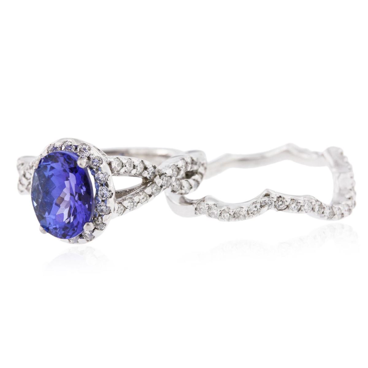 One electronically tested 14KT white gold ladies cast tanzanite and diamond engagement ring & wedding band with a bright polish finish. Identified with markings of "14K". Condition is new. Containing: One prong set oval modified brilliant cut natural tanzanite, measuring 9.20 x 6.80 x 4.42mm, approximate weight of 1.95ct., clarity is eye clean, type I, medium, moderately strong, bluish violet color, (GIA bV 5/4), cut is good. Seventy-Seven prong set round brilliant cut diamonds, measuring 1.30 - 1.30 x 0.78mm (depth est.) approximate total weight of 77 Stones = 0.62ct. Clarity: SI-2 to I-2. Color: I - J, Cut is Good. Colored gemstones are presumed to have been subjected to commonly used enhancement processes. All diamonds and colored gemstones are graded in the mounting, unless otherwise stated. Total Weight of Colored Stones 1.95ct. Total Weight of Diamonds 0.62ct. Total Weight of Engagement Ring & Wedding Band 8.40 grams. GGL Appraised at $5,080.00.