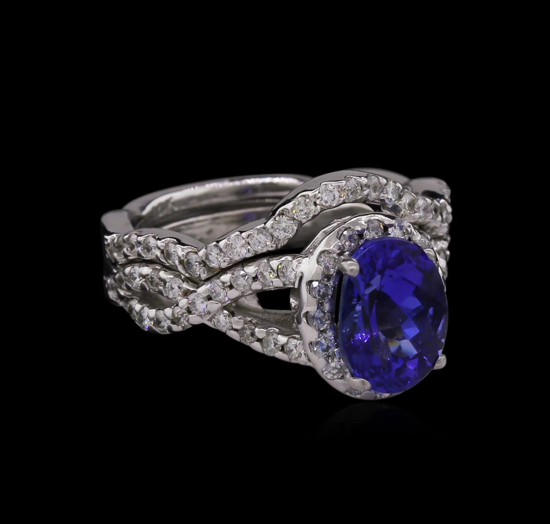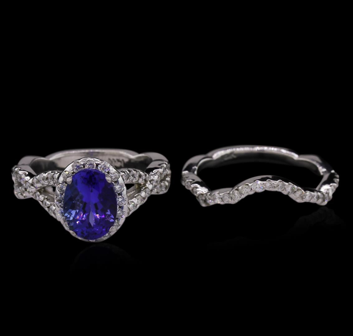 One electronically tested 14KT white gold ladies cast tanzanite and diamond engagement ring & wedding band with a bright polish finish. Identified with markings of "14K". Condition is new. Containing: One prong set oval modified brilliant cut natural tanzanite, measuring 9.20 x 6.80 x 4.42mm, approximate weight of 1.95ct., clarity is eye clean, type I, medium, moderately strong, bluish violet color, (GIA bV 5/4), cut is good. Seventy-Seven prong set round brilliant cut diamonds, measuring 1.30 - 1.30 x 0.78mm (depth est.) approximate total weight of 77 Stones = 0.62ct. Clarity: SI-2 to I-2. Color: I - J, Cut is Good. Colored gemstones are presumed to have been subjected to commonly used enhancement processes. All diamonds and colored gemstones are graded in the mounting, unless otherwise stated. Total Weight of Colored Stones 1.95ct. Total Weight of Diamonds 0.62ct. Total Weight of Engagement Ring & Wedding Band 8.40 grams. GGL Appraised at $5,080.00.