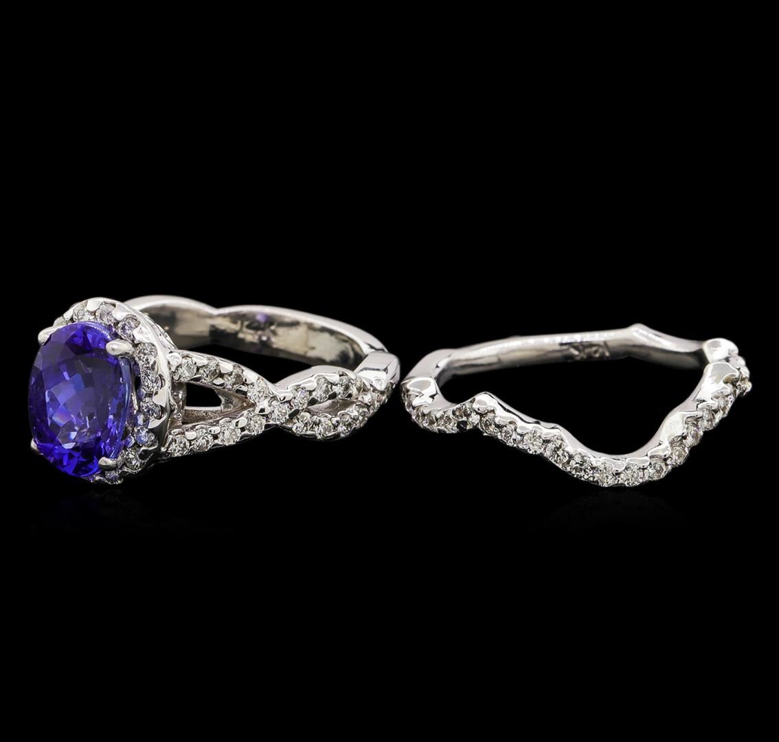 One electronically tested 14KT white gold ladies cast tanzanite and diamond engagement ring & wedding band with a bright polish finish. Identified with markings of "14K". Condition is new. Containing: One prong set oval modified brilliant cut natural tanzanite, measuring 9.20 x 6.80 x 4.42mm, approximate weight of 1.95ct., clarity is eye clean, type I, medium, moderately strong, bluish violet color, (GIA bV 5/4), cut is good. Seventy-Seven prong set round brilliant cut diamonds, measuring 1.30 - 1.30 x 0.78mm (depth est.) approximate total weight of 77 Stones = 0.62ct. Clarity: SI-2 to I-2. Color: I - J, Cut is Good. Colored gemstones are presumed to have been subjected to commonly used enhancement processes. All diamonds and colored gemstones are graded in the mounting, unless otherwise stated. Total Weight of Colored Stones 1.95ct. Total Weight of Diamonds 0.62ct. Total Weight of Engagement Ring & Wedding Band 8.40 grams. GGL Appraised.