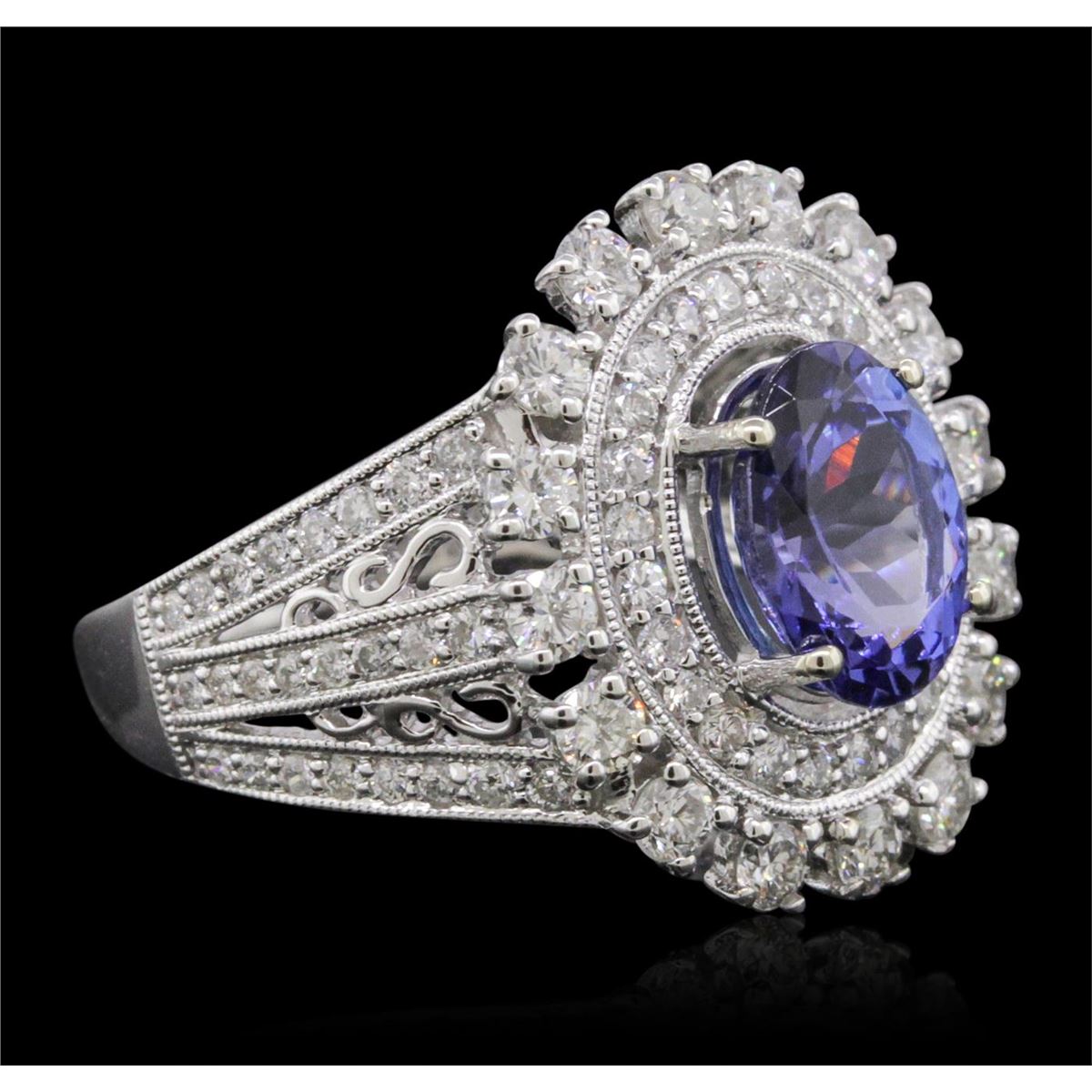 One electronically tested 14KT white gold ladies combination cast & assembled tanzanite and diamond ring with a split shank with a bright polish finish. Identified with markings of "14K". Condition is new. Containing: One prong set oval modified brilliant cut natural tanzanite, measuring 8.91 x 6.92 x 4.65mm, approximate weight of 1.95ct., clarity is eye clean, type I, medium, moderately strong, violet color, (GIA V 5/4), cut is good. Sixteen prong set round brilliant cut diamonds, measuring 2.10 - 2.10 x 1.26mm (depth est.) approximate total weight of 16 Stones = 0.54ct. Clarity: SI-1 to SI-2. Color: I - J, Cut is Good. Seventy-Two prong set round brilliant cut diamonds, measuring 1.10 - 1.10 x 0.66mm (depth est.) approximate total weight of 72 Stones = 0.35ct. Clarity: SI-2 to I-2. Color: I - J, Cut is Good. Colored gemstones are presumed to have been subjected to commonly used enhancement processes. All diamonds and colored gemstones are graded in the mounting, unless otherwise stated. Total Weight of Colored Stones 1.95ct. Total Weight of Diamonds 0.89ct. Total Weight of Ring 5.80 grams. GGL Appraised at $6,975.00.