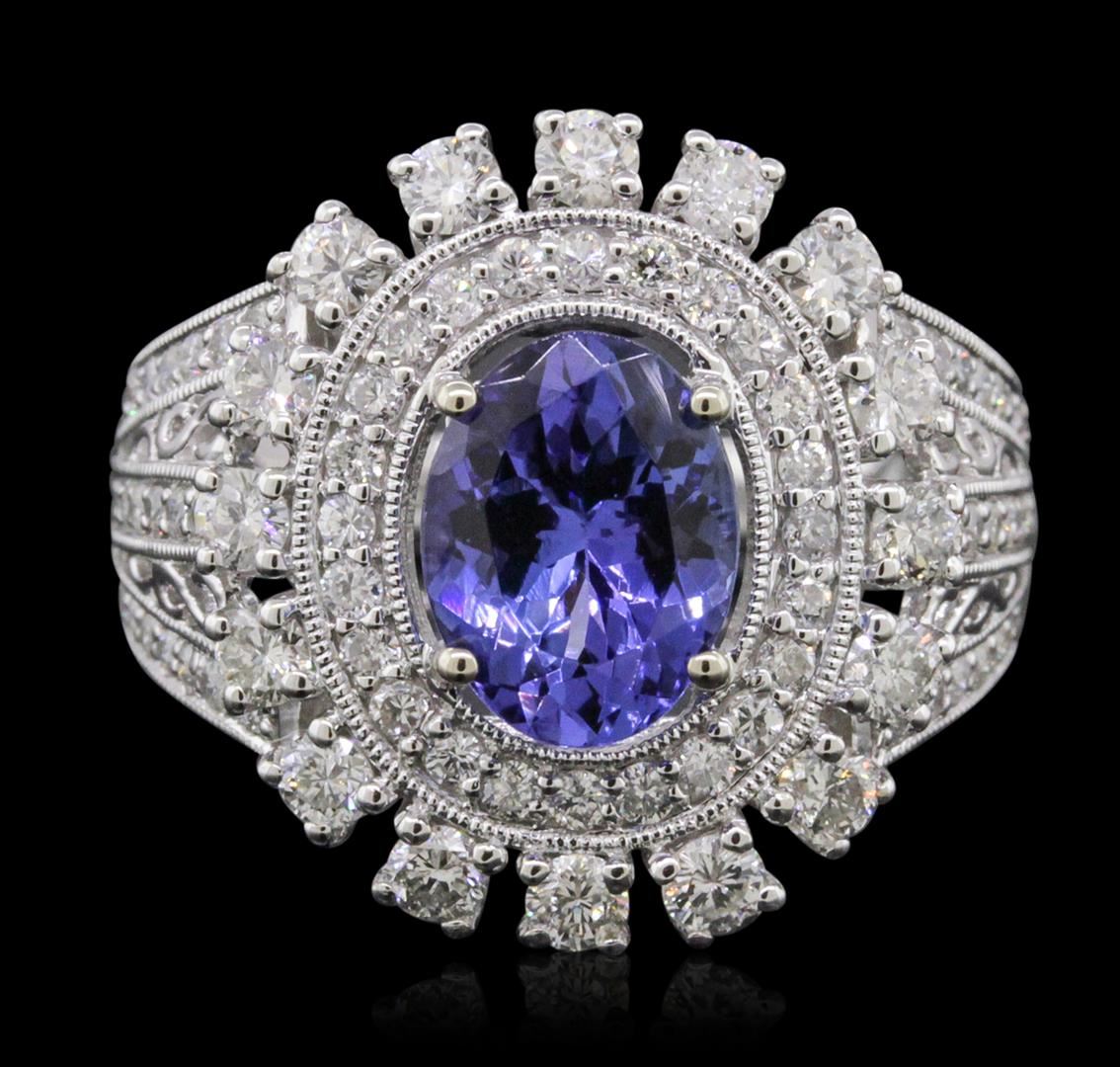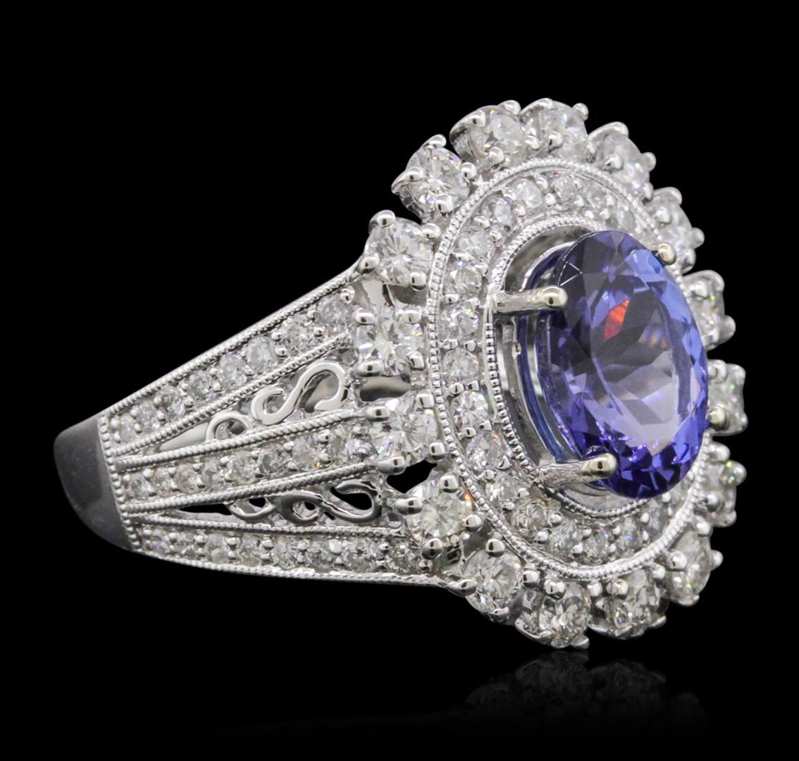 One electronically tested 14KT white gold ladies combination cast & assembled tanzanite and diamond ring with a split shank with a bright polish finish. Identified with markings of "14K". Condition is new. Containing: One prong set oval modified brilliant cut natural tanzanite, measuring 8.91 x 6.92 x 4.65mm, approximate weight of 1.95ct., clarity is eye clean, type I, medium, moderately strong, violet color, (GIA V 5/4), cut is good. Sixteen prong set round brilliant cut diamonds, measuring 2.10 - 2.10 x 1.26mm (depth est.) approximate total weight of 16 Stones = 0.54ct. Clarity: SI-1 to SI-2. Color: I - J, Cut is Good. Seventy-Two prong set round brilliant cut diamonds, measuring 1.10 - 1.10 x 0.66mm (depth est.) approximate total weight of 72 Stones = 0.35ct. Clarity: SI-2 to I-2. Color: I - J, Cut is Good. Colored gemstones are presumed to have been subjected to commonly used enhancement processes. All diamonds and colored gemstones are graded in the mounting, unless otherwise stated. Total Weight of Colored Stones 1.95ct. Total Weight of Diamonds 0.89ct. Total Weight of Ring 5.80 grams. GGL Appraised at $6,975.00.