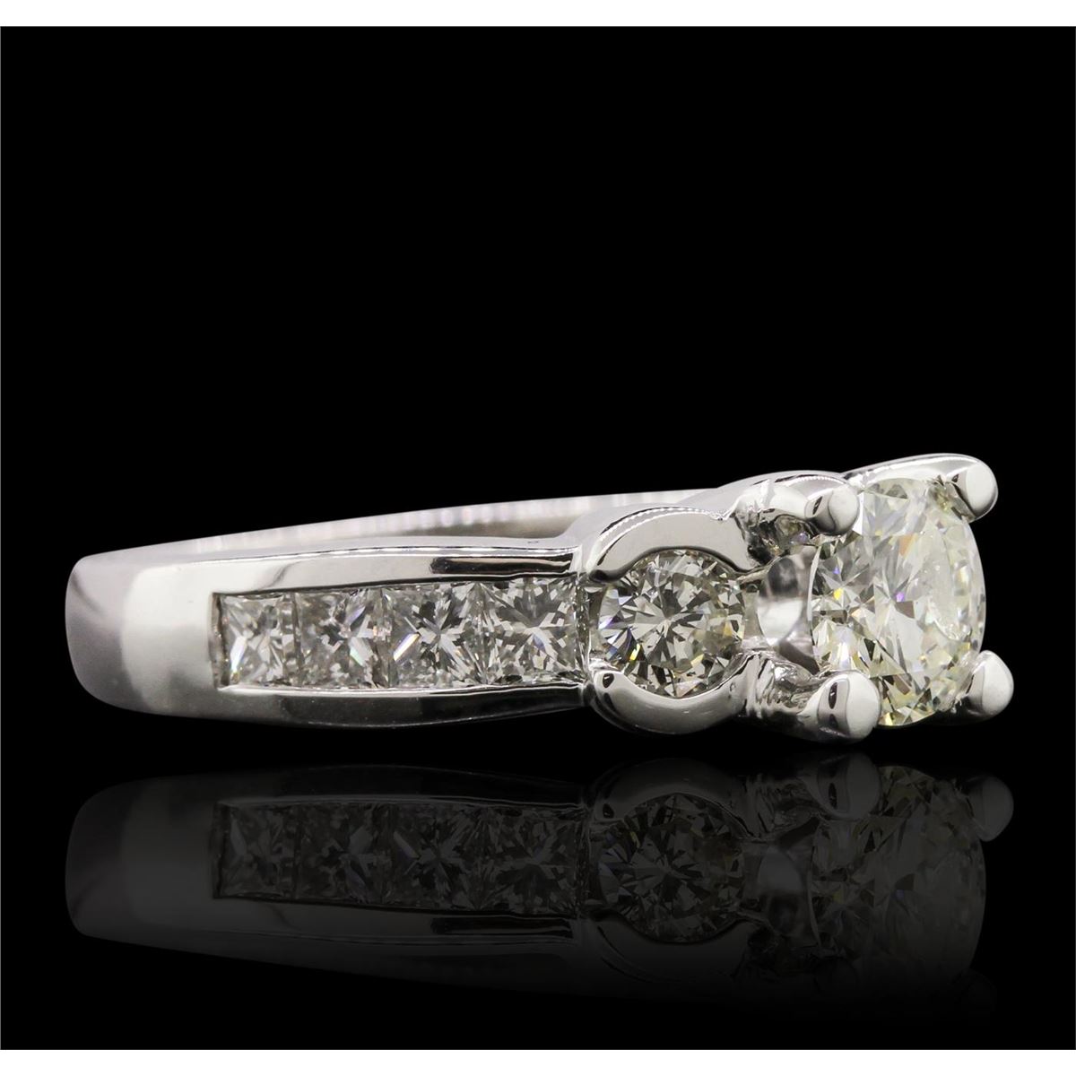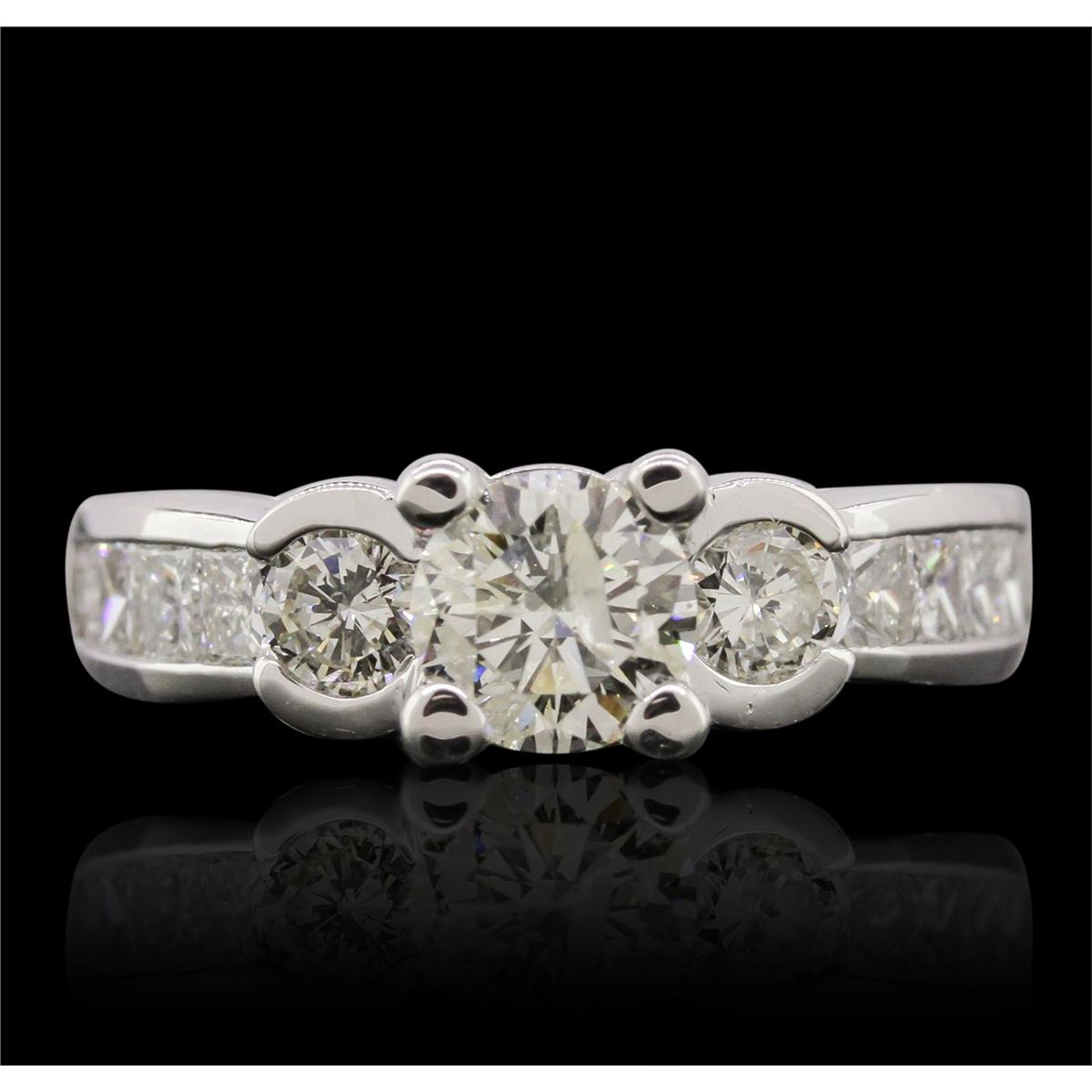 One electronically tested 14KT white gold ladies cast diamond unity ring with a bright polish finish. Condition is new, good workmanship. The featured diamond is supported by diamond set shoulders, completed by a two and one-half millimeter wide band. Identified with markings of "14K". Containing: One prong set round brilliant cut diamond, measuring 5.70 - 5.65 x 3.30mm (depth est.) approximate weight of 0.75ct. Graded in the setting. Clarity: I-1 . Color: 58.1%. Table 40.9%. Two bezel set round brilliant cut diamonds, measuring 3.80 - 3.70 x 2.25mm (depth est.) approximate. Total Weight of 2 Stones = 0.40ct. Graded in the setting. Clarity: SI-2 to I-1 . Color: I - J Eight channel set princess cut diamonds, measuring 2.50 x 2.40 x 1.80mm (depth est.) approximate. Total Weight of 8 Stones = 0.80ct. Graded in the setting. Clarity: VVS-2 to VS-2. Color: H - I. Total Weight of Diamonds 1.95ct.. Total Weight of Ring 5.53 grams. AIG Appraised at $9,380.00.