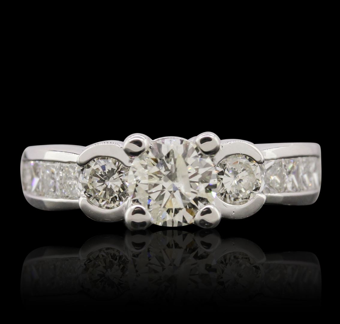 One electronically tested 14KT white gold ladies cast diamond unity ring with a bright polish finish. Condition is new, good workmanship. The featured diamond is supported by diamond set shoulders, completed by a two and one-half millimeter wide band. Identified with markings of "14K". Containing: One prong set round brilliant cut diamond, measuring 5.70 - 5.65 x 3.30mm (depth est.) approximate weight of 0.75ct. Graded in the setting. Clarity: I-1 . Color: 58.1%. Table 40.9%. Two bezel set round brilliant cut diamonds, measuring 3.80 - 3.70 x 2.25mm (depth est.) approximate. Total Weight of 2 Stones = 0.40ct. Graded in the setting. Clarity: SI-2 to I-1 . Color: I - J Eight channel set princess cut diamonds, measuring 2.50 x 2.40 x 1.80mm (depth est.) approximate. Total Weight of 8 Stones = 0.80ct. Graded in the setting. Clarity: VVS-2 to VS-2. Color: H - I. Total Weight of Diamonds 1.95ct.. Total Weight of Ring 5.53 grams. AIG Appraised at $9,380.00.