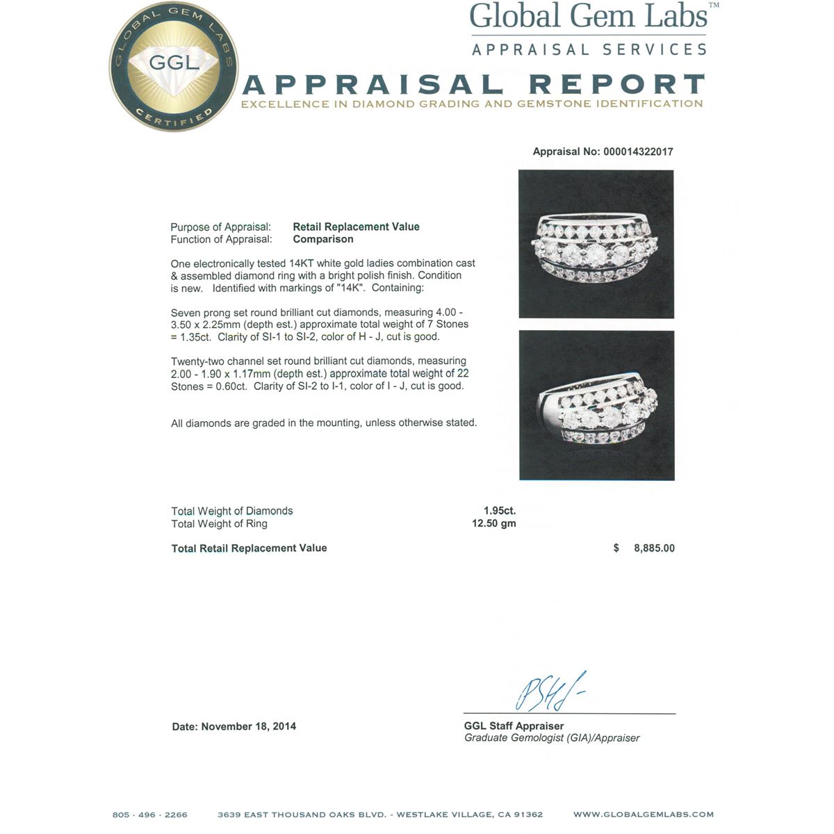 One electronically tested 14KT white gold ladies combination cast & assembled diamond ring with a bright polish finish. Identified with markings of "14K". Condition is new. Containing: Seven prong set round brilliant cut diamonds, measuring 4.00 - 3.50 x 2.25mm (depth est.) approximate total weight of 7 Stones = 1.35ct. Clarity: SI-1 to SI-2. Color: H - J, Cut is Good. Twenty-Two channel set round brilliant cut diamonds, measuring 2.00 - 1.90 x 1.17mm (depth est.) approximate total weight of 22 Stones = 0.60ct. Clarity: SI-2 to I-1. Color: I - J, Cut is Good. All diamonds are graded in the mounting, unless otherwise stated. Total Weight of Diamonds 1.95ct. Total Weight of Ring 12.50 grams. GGL Appraised at $8,885.00.