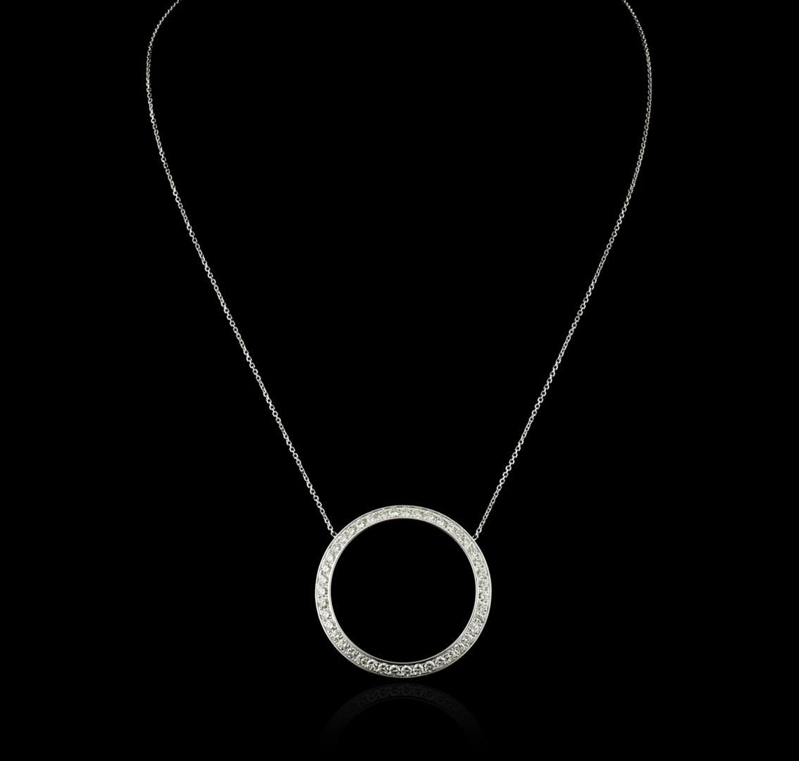 One electronically tested 14KT white gold ladies cast diamond pendant & chain 18.0" long, with a spring ring clasp with a bright polish finish. Identified with markings of "14K". Condition is new. Containing: Forty-Four prong set round brilliant cut diamonds, measuring 2.30 - 2.30 x 1.38mm (depth est.) approximate total weight of 44 Stones = 1.96ct. Clarity: SI-1. Color: J - K, Cut is Good. All diamonds are graded in the mounting, unless otherwise stated. Total Weight of Diamonds 1.96ct. Total Weight of Pendant & Chain 9.00 grams. GGL Appraised at $4,680.00.