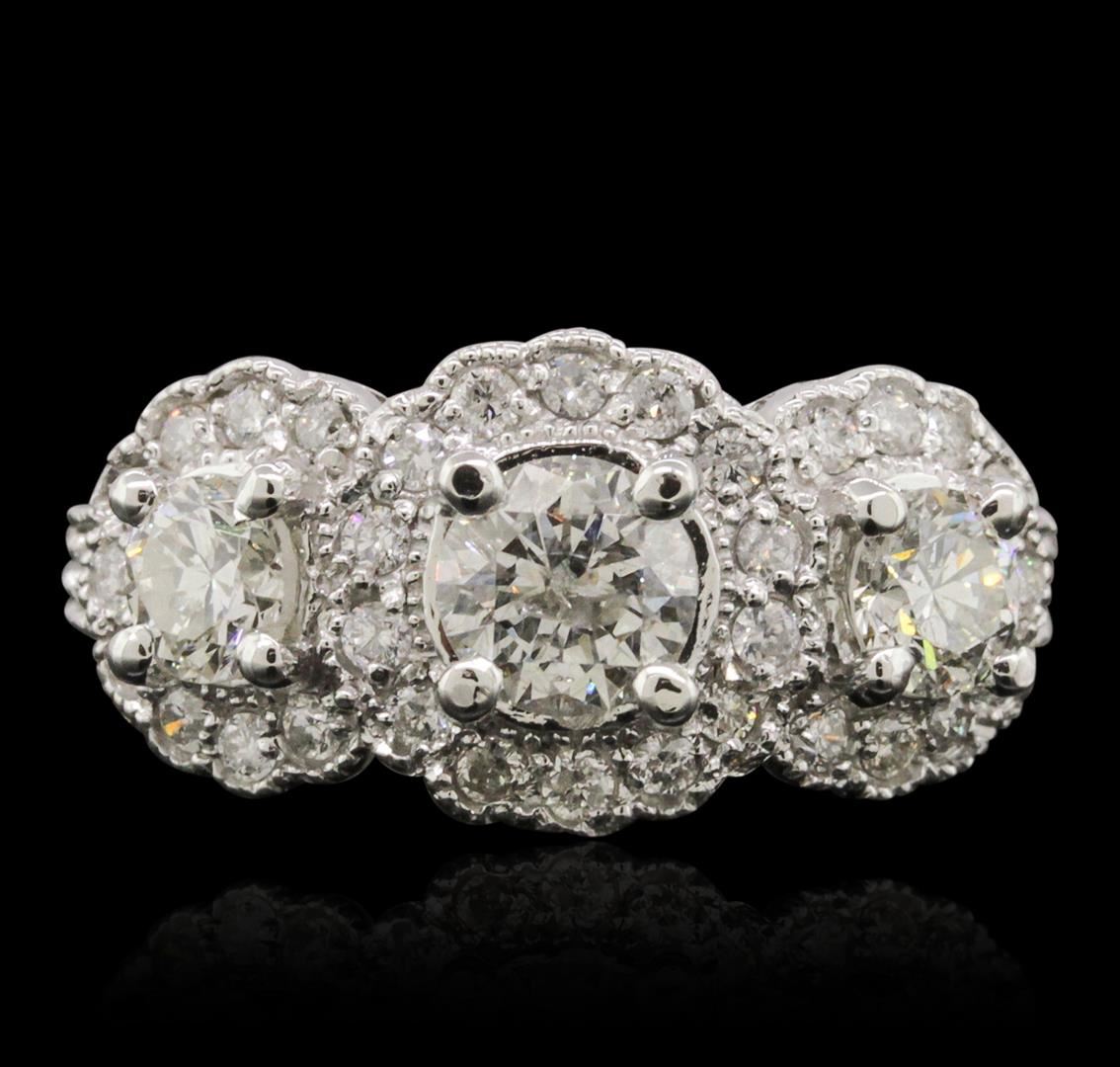 One electronically tested 14KT white gold ladies cast diamond ring. Condition is new, good workmanship. The ring features a trio of diamonds set within diamond set floral bezel supported by diamond set shoulders, completed by a two and one-half millimeter wide band. Bright polish finish with milgrain detailing. Identified with markings of "K14". Containing: One prong set round brilliant cut diamond, measuring 5.50 - 5.45 x 3.40mm (depth est.) approximate weight of 0.65ct. Graded in the setting. Clarity: I-1. Color: J Two prong set round brilliant cut diamonds, measuring 4.50 - 4.45 x 2.69mm (depth est.) approximate. Total Weight of 2 Stones = 0.70ct. Color & clarity grade are an average for the pair. Graded in the setting. Clarity: SI-2. Color: J Thirty-Eight prong set round brilliant cut diamonds, measuring 1.60 - 1.50 x 0.93mm (depth est.) approximate. Total Weight of 38 Stones = 0.61ct. Graded in the setting. Clarity: SI-2 to I-2. Color: G - I. Total Weight of Diamonds 1.96ct. Total Weight of Ring 6.35gm. AIG Appraised at $9,750.00.
