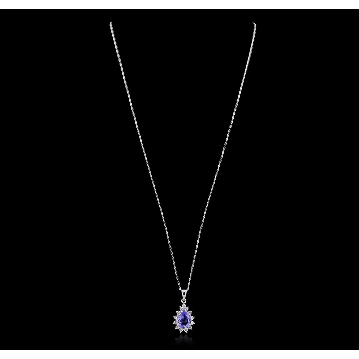 One electronically tested 14KT white gold ladies cast & assembled tanzanite and diamond pendant with chain. The pendant features a tanzanite set within a diamond bezel, completed by a white gold bail. The pendant is supported by an eighteen inch length 14KT white gold designer style chain, terminating in a spring ring clasp. Bright polish finish. Trademark is Orianne. Identified with markings of "14K". Condition is new, good workmanship. Containing: One prong set pear brilliant cut natural tanzanite, measuring 9.70 x 7.50 x 3.80mm, 6% bulge factor, approximate weight of 1.96ct., clarity is eye clean, type I, medium dark, very slightly grayish, bluish violet color, (GIA bV 6/3), cut is good. Transmitting light with no distortion, transparent. Graded in the setting. Tanzanite is a very rare gemstone that is only found in the country of Tanzania. Originally discovered in 1967. Tiffany & Company, named the stone Tanzanite. It is found in the Usumburu Mountains that border the Umba Valley of northern Tanzania. Tanzanite occurs in gray, brown, violet, blue, reddish-purple, & green. The gem is interesting because of its exceptional pleochroism. Rotated in different directions a tanzanite will exhibit multiple changes of color. Tanzanite has a low tolerance to ultrasonic cleaning, and should not be cleaned using this method. Thirteen prong set round brilliant cut diamonds, measuring 2.30 - 2.20 x 1.35mm (depth est.) approximate total weight of 13 Stones = 0.64ct. Graded in the setting. Clarity: SI-1 to I-1. Color: G - I. Total Weight of Colored Stones 1.96ct. Total Weight of Diamonds 0.64ct. Total Weight of Pendant With Chain 3.58 grams. AIG Appraised at $6,250.00.