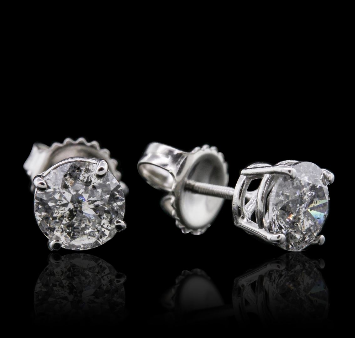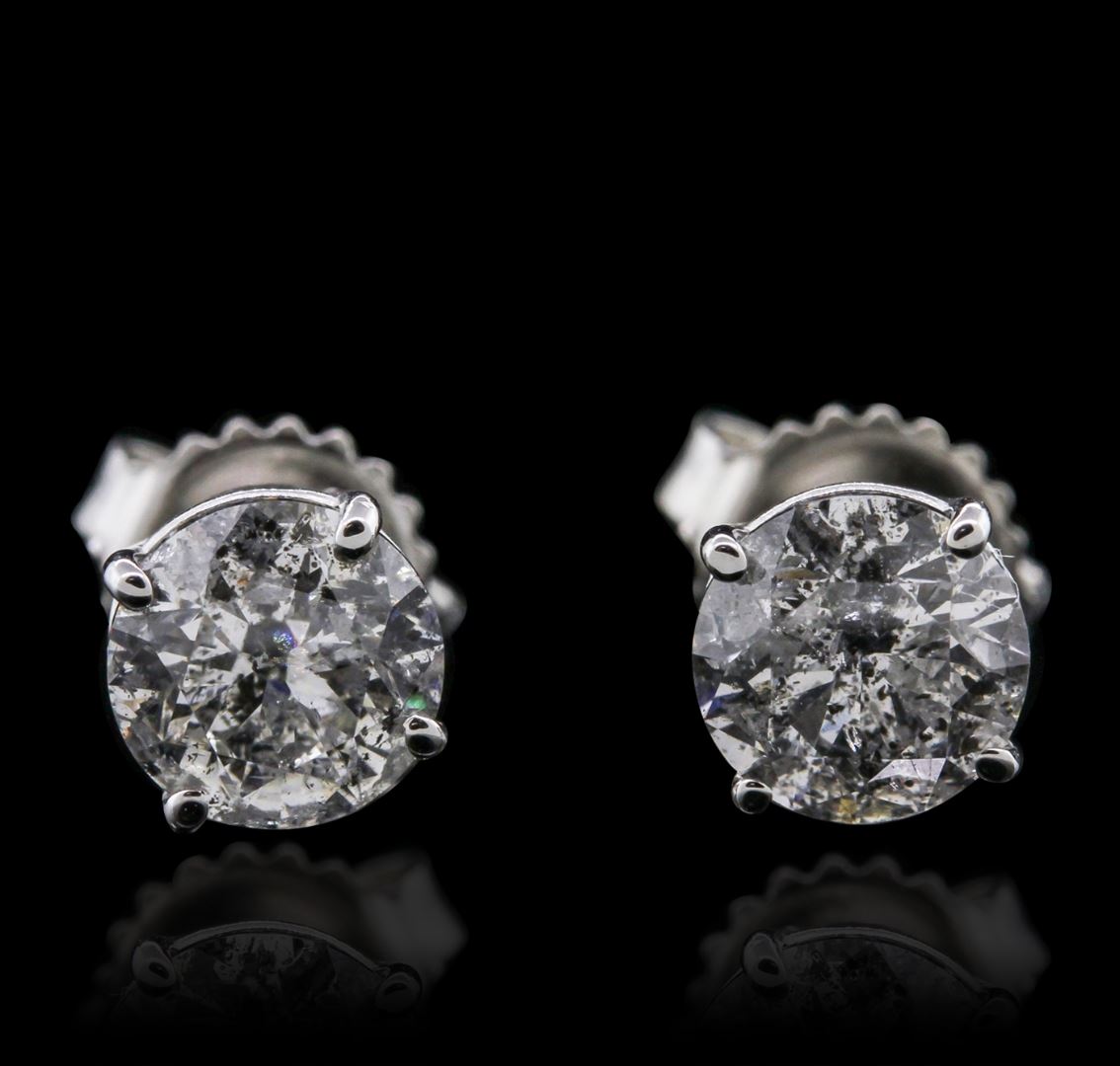 One pair electronically tested 14KT white gold cast & assembled diamond solitaire earrings with standard backs. Condition is new, good workmanship. Identified with markings of "14K". Containing: One prong set round brilliant cut diamond, measuring 6.27 - 6.20 x 3.90mm (depth est.), 3.00.%. GTCF approximate weight of 0.96ct. Graded in the setting. Clarity: I-2. Color: H Depth 62.6%. Table 56.2%. One prong set round brilliant cut diamond, measuring 6.26 - 6.25 x 4.00mm (depth est.), 4.00.%. GTCF approximate weight of 1.00ct with a faint blue fluorescence. Graded in the setting. Clarity: I-2. Color: I Depth 63.9%. Table 56.7%. Total Weight of Diamonds 1.96ct. Total Weight of Earrings 1.43 grams. AIG Appraised at $11,400.00.