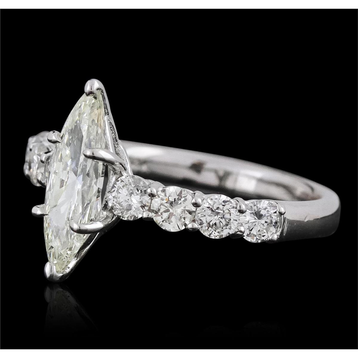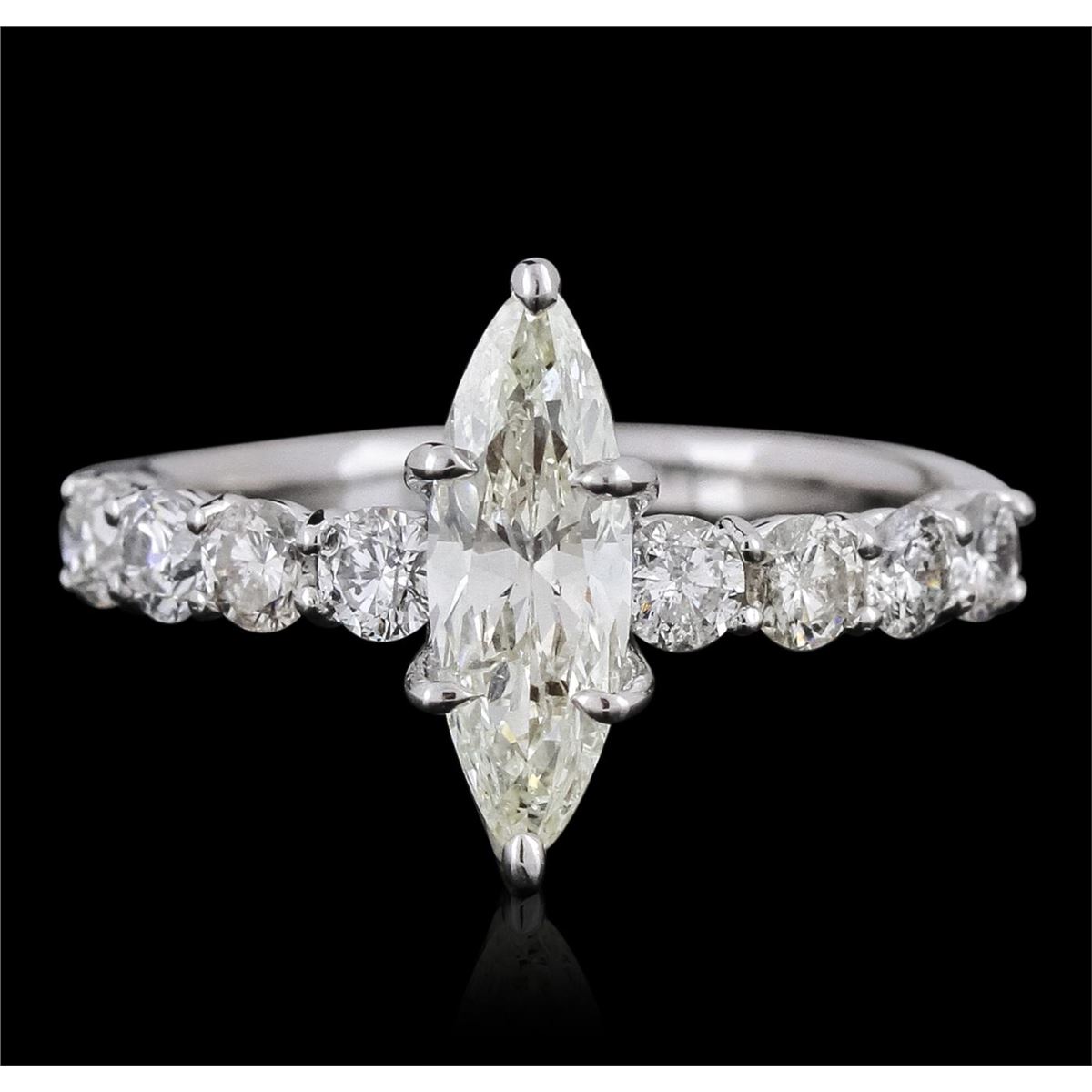 One electronically tested 14KT white gold ladies cast diamond unity ring with a bright polish finish. The featured diamond is supported by diamond set shoulders, completed by a two millimeter wide band. Identified with markings of "14K". Condition is new, good workmanship. Containing: One prong set marquise shaped cut diamond, measuring 13.00 x 4.45 x 2.95mm (depth est.) approximate weight of 1.11ct with a faint red fluorescence. Graded in the setting. Clarity: SI-2. Color: L. Depth 66.3%. Table 60.7%. Eight prong set round brilliant cut diamonds, measuring 3.00 - 2.90 x 1.77mm (depth est.) approximate total weight of 8 Stones = 0.85ct. Graded in the setting. Clarity: SI-1 to I-1. Color: G - I. Total Weight of Diamonds 1.96ct. Total Weight of Unity Ring 3.14 grams. AIG Appraised at $13,735.00.