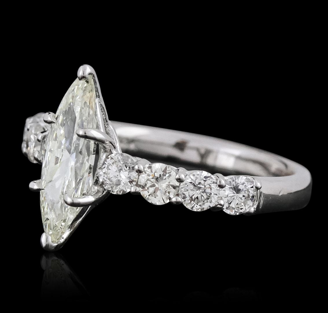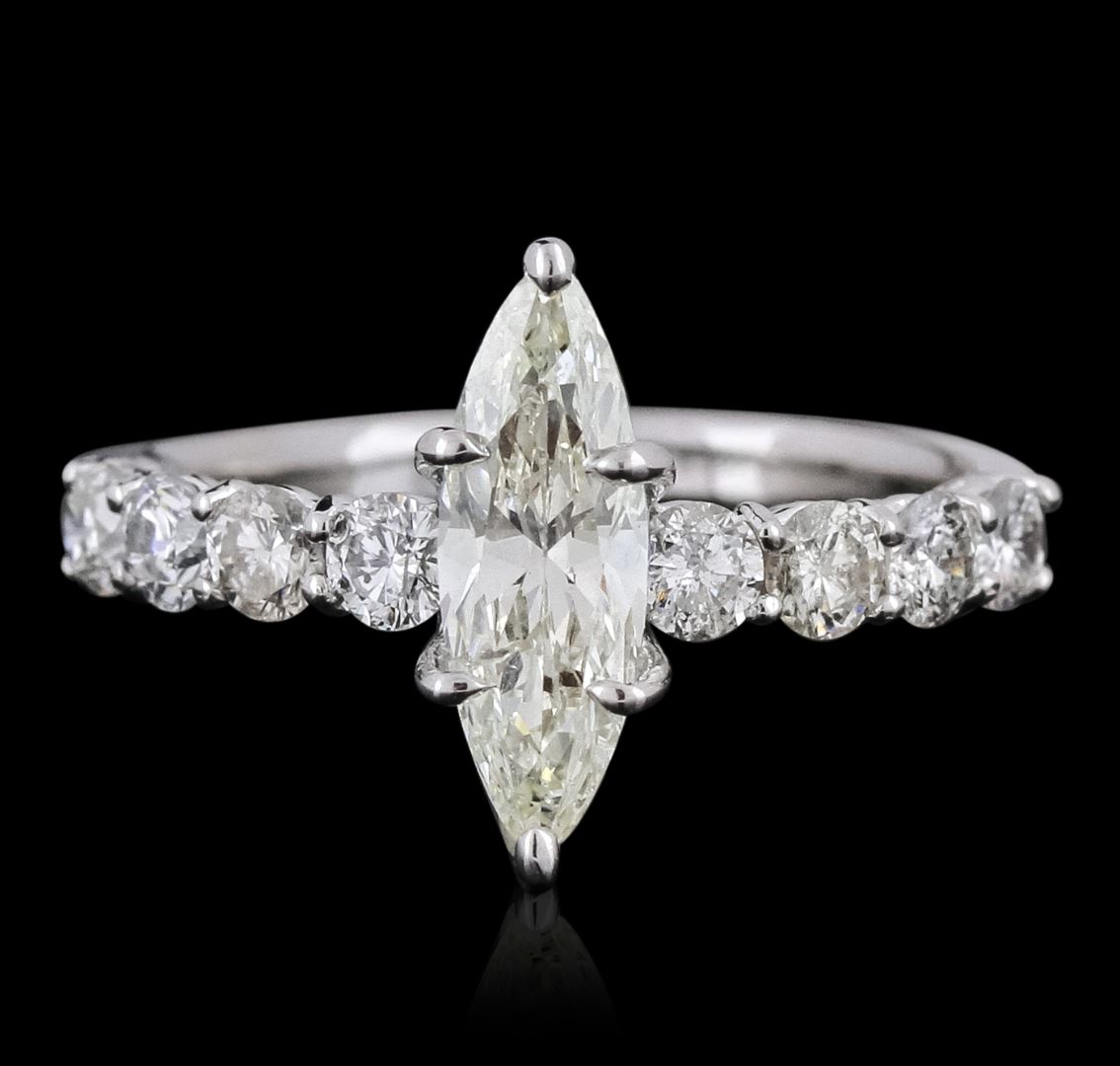 One electronically tested 14KT white gold ladies cast diamond unity ring with a bright polish finish. The featured diamond is supported by diamond set shoulders, completed by a two millimeter wide band. Identified with markings of "14K". Condition is new, good workmanship. Containing: One prong set marquise shaped cut diamond, measuring 13.00 x 4.45 x 2.95mm (depth est.) approximate weight of 1.11ct with a faint red fluorescence. Graded in the setting. Clarity: SI-2. Color: L. Depth 66.3%. Table 60.7%. Eight prong set round brilliant cut diamonds, measuring 3.00 - 2.90 x 1.77mm (depth est.) approximate total weight of 8 Stones = 0.85ct. Graded in the setting. Clarity: SI-1 to I-1. Color: G - I. Total Weight of Diamonds 1.96ct. Total Weight of Unity Ring 3.14 grams. AIG Appraised at $13,735.00.