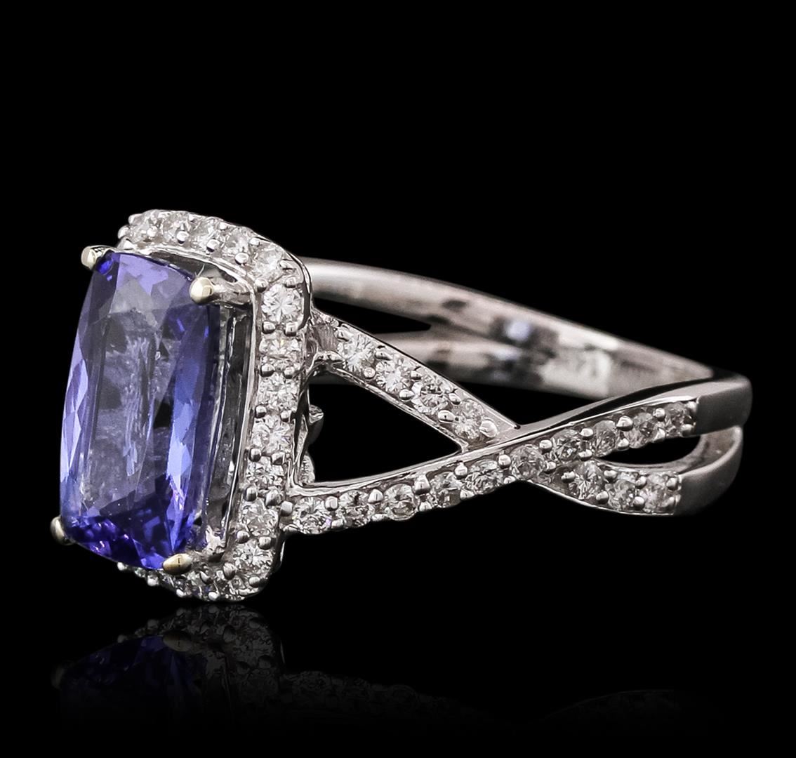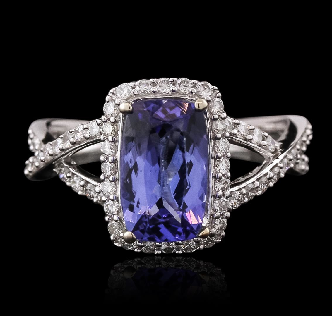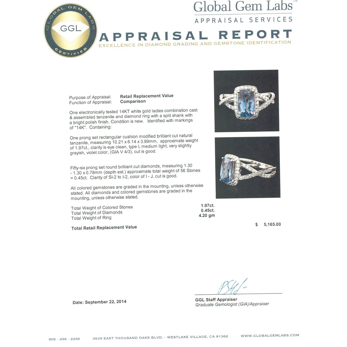 One electronically tested 14KT white gold ladies combination cast & assembled tanzanite and diamond ring with a split shank with a bright polish finish. Identified with markings of "14K". Condition is new. Containing: One prong set rectangular cushion modified brilliant cut natural tanzanite, measuring 10.21 x 6.14 x 3.99mm, approximate weight of 1.97ct., clarity is eye clean, type I, medium light, very slightly grayish, violet color, (GIA V 4/3), cut is good. Fifty-Six prong set round brilliant cut diamonds, measuring 1.30 - 1.30 x 0.78mm (depth est.) approximate total weight of 56 Stones = 0.45ct. Clarity: SI-2 to I-2. Color: I - J, Cut is Good. All colored gemstones are graded in the mounting, unless otherwise stated. All diamonds and colored gemstones are graded in the mounting, unless otherwise stated. Total Weight of Colored Stones 1.97ct. Total Weight of Diamonds 0.45ct. Total Weight of Ring 4.20 grams. GGL Appraised at $5,165.00.