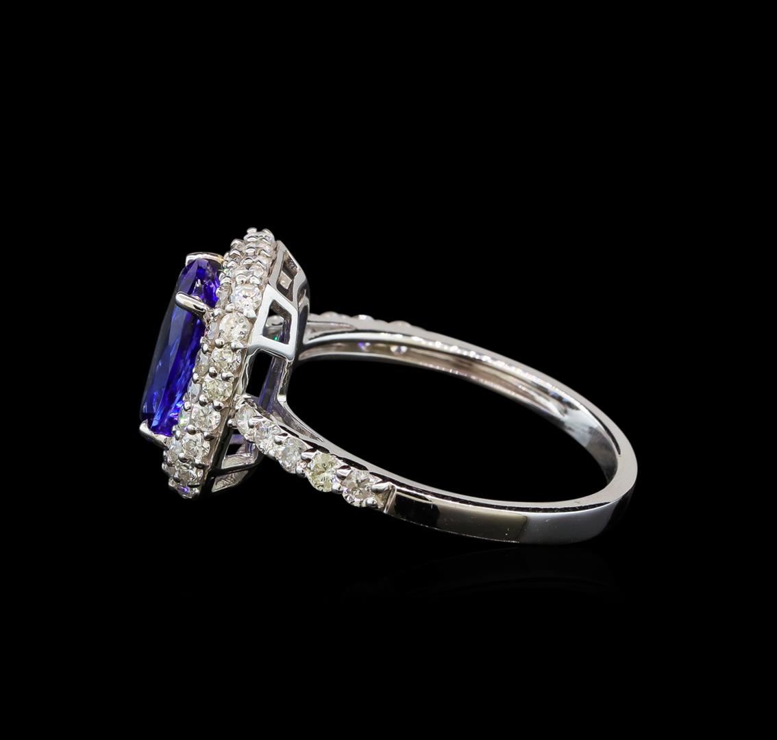 One electronically tested 14KT white gold ladies cast tanzanite and diamond ring with a flat shank with a bright polish finish. Trademark is Orianne. Identified with markings of "14K". Condition is new. Containing: One prong set rectangular cushion modified brilliant cut natural tanzanite, measuring 9.32 x 6.39 x 4.20mm, approximate weight of 1.97ct., clarity is eye clean, type I, medium light, very slightly grayish, violetish blue color, (GIA vB 4/3), cut is good. Fifty-Four prong set round brilliant cut diamonds, measuring 1.60 - 1.50 x 0.93mm (depth est.) approximate total weight of 54 Stones = 0.73ct. Clarity: SI-2 to I-2. Color: I - J, Cut is Good. All diamonds and colored gemstones are graded in the mounting, unless otherwise stated. Colored gemstones are presumed to have been subjected to commonly used enhancement processes. Total Weight of Colored Stones 1.97ct. Total Weight of Diamonds 0.73ct. Total Weight of Ring 3.00 grams. GGL Appraised at $3,755.00.