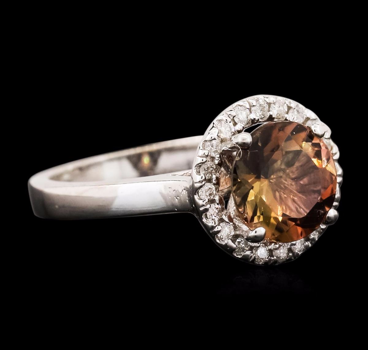 One electronically tested 14KT white gold ladies cast brown tourmaline and diamond ring with a bright polish finish. The featured brown tourmaline is set within a diamond bezel, completed by a two millimeter wide band. Identified with markings of "14K". Condition is new, good workmanship. Containing: One prong set round brilliant cut natural brown tourmaline, measuring 7.95 - 7.90 x 4.80 mm, 6% bulge factor, approximate weight of 1.97ct., clarity is eye clean, medium dark, moderately strong, brown color, (GIA Br 6/4), cut is good. Transmitting light with no distortion, transparent. Refractive index testing results of 1.62 to 1.64. This is a conclusive result for tourmaline. Graded in the setting. Twenty prong set round brilliant cut diamonds, measuring 1.30 - 1.20 x 0.75mm (depth est.) approximate total weight of 20 Stones = 0.24ct. Graded in the setting. Clarity: I-1 to I-2. Color: G - I. Total Weight of Colored Stones 1.97ct. Total Weight of Diamonds 0.24ct. Total Weight of Ring 4.05 grams. AIG Appraised at $1,535.00.