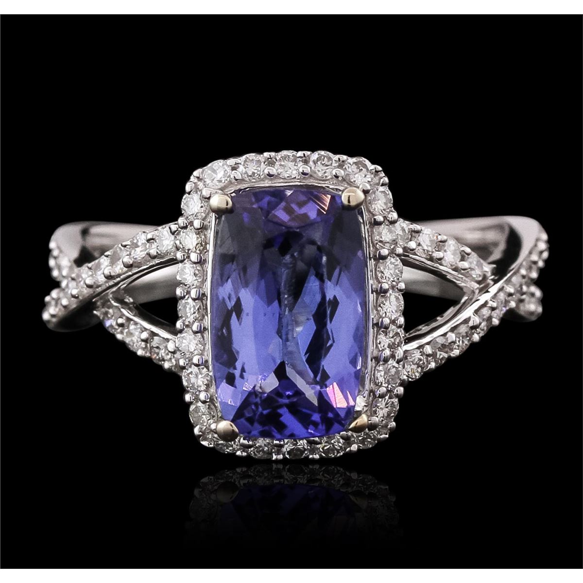 One electronically tested 14KT white gold ladies combination cast & assembled tanzanite and diamond ring with a split shank with a bright polish finish. Identified with markings of "14K". Condition is new. Containing: One prong set rectangular cushion modified brilliant cut natural tanzanite, measuring 10.21 x 6.14 x 3.99mm, approximate weight of 1.97ct., clarity is eye clean, type I, medium light, very slightly grayish, violet color, (GIA V 4/3), cut is good. Fifty-Six prong set round brilliant cut diamonds, measuring 1.30 - 1.30 x 0.78mm (depth est.) approximate total weight of 56 Stones = 0.45ct. Clarity: SI-2 to I-2. Color: I - J, Cut is Good. All colored gemstones are graded in the mounting, unless otherwise stated. All diamonds and colored gemstones are graded in the mounting, unless otherwise stated. Total Weight of Colored Stones 1.97ct. Total Weight of Diamonds 0.45ct. Total Weight of Ring 4.20 grams. GGL Appraised at $5,165.00.