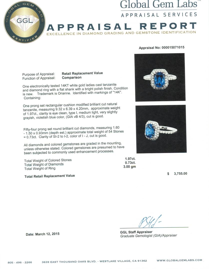 One electronically tested 14KT white gold ladies cast tanzanite and diamond ring with a flat shank with a bright polish finish. Trademark is Orianne. Identified with markings of "14K". Condition is new. Containing: One prong set rectangular cushion modified brilliant cut natural tanzanite, measuring 9.32 x 6.39 x 4.20mm, approximate weight of 1.97ct., clarity is eye clean, type I, medium light, very slightly grayish, violetish blue color, (GIA vB 4/3), cut is good. Fifty-Four prong set round brilliant cut diamonds, measuring 1.60 - 1.50 x 0.93mm (depth est.) approximate total weight of 54 Stones = 0.73ct. Clarity: SI-2 to I-2. Color: I - J, Cut is Good. All diamonds and colored gemstones are graded in the mounting, unless otherwise stated. Colored gemstones are presumed to have been subjected to commonly used enhancement processes. Total Weight of Colored Stones 1.97ct. Total Weight of Diamonds 0.73ct. Total Weight of Ring 3.00 grams. GGL Appraised at $3,755.00.