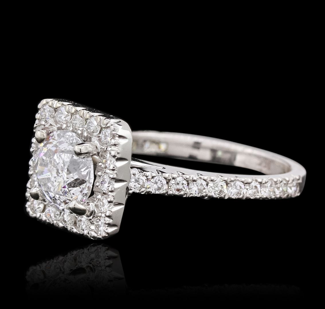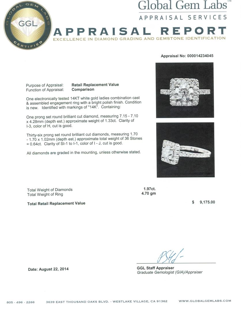 One electronically tested 14KT white gold ladies combination cast & assembled engagement ring with a bright polish finish. Identified with markings of "14K". Condition is new. Containing: One prong set round brilliant cut diamond, measuring 7.15 - 7.10 x 4.28mm (depth est.) approximate weight of 1.33ct. Clarity: I-3. Color: H, Cut is Good. Thirty-Six prong set round brilliant cut diamonds, measuring 1.70 - 1.70 x 1.02mm (depth est.) approximate total weight of 36 Stones = 0.64ct. Clarity: SI-1 to I-1. Color: I - J, Cut is Good. All diamonds are graded in the mounting, unless otherwise stated. Total Weight of Diamonds 1.97ct. Total Weight of Ring 4.70 grams. GGL Appraised at $9,175.00.