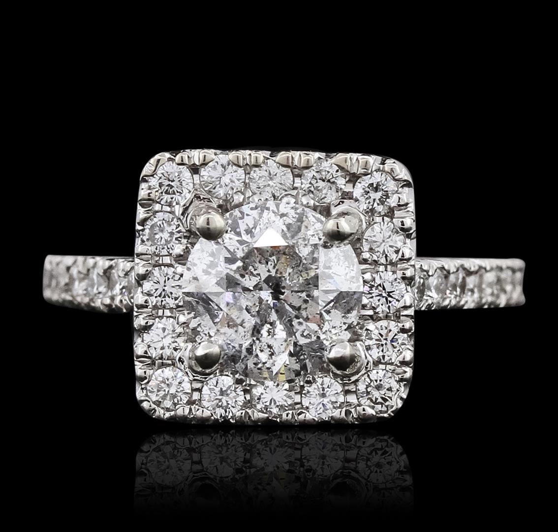 One electronically tested 14KT white gold ladies combination cast & assembled engagement ring with a bright polish finish. Identified with markings of "14K". Condition is new. Containing: One prong set round brilliant cut diamond, measuring 7.15 - 7.10 x 4.28mm (depth est.) approximate weight of 1.33ct. Clarity: I-3. Color: H, Cut is Good. Thirty-Six prong set round brilliant cut diamonds, measuring 1.70 - 1.70 x 1.02mm (depth est.) approximate total weight of 36 Stones = 0.64ct. Clarity: SI-1 to I-1. Color: I - J, Cut is Good. All diamonds are graded in the mounting, unless otherwise stated. Total Weight of Diamonds 1.97ct. Total Weight of Ring 4.70 grams. GGL Appraised at $9,175.00.