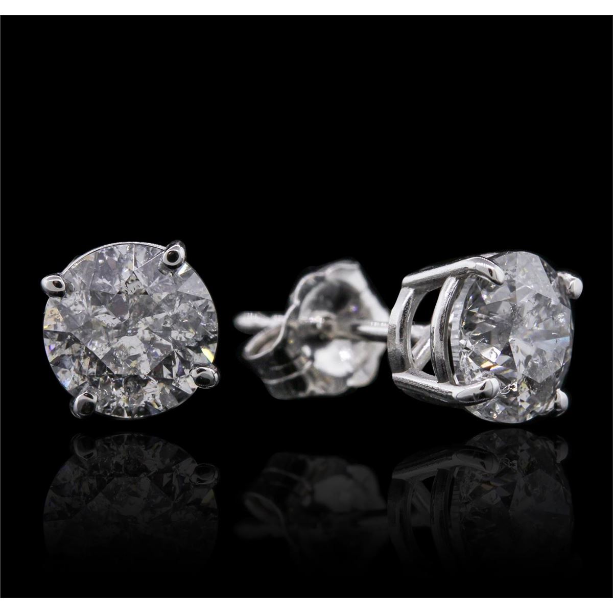 One pair electronically tested 14KT white gold cast & assembled diamond solitaire earrings with standard backs. Condition is new, excellent workmanship. Bright polish finish. Identified with markings of "14Kt". Containing: One prong set round brilliant cut diamond, measuring 6.10 - 6.10 x 4.10mm (depth est.) approximate weight of 0.99ct with a faint blue fluorescence. Graded in the setting. Clarity: I-3. Color: G Depth 67.2%. Table 50.8%. One prong set round brilliant cut diamond, measuring 6.00 - 6.00 x 4.10mm (depth est.) approximate weight of 0.98ct with a faint fluorescence. Graded in the setting. Clarity: I-2. Color: G Depth 68.3%. Table 53.3%. Total Weight of Diamonds 1.97ct. Total Weight of Earrings 1.20 grams. AIG Appraised at $9,175.00.