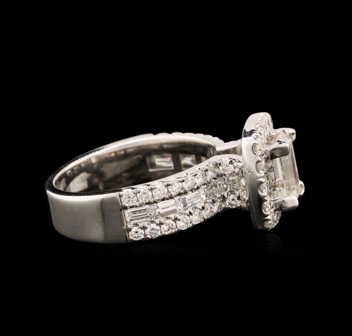 One electronically tested 14KT white gold ladies combination cast & assembled diamond engagement ring with a flat shank with a bright polish finish. Identified with markings of "14K". Condition is new. Containing: One prong set emerald cut diamond, measuring 6.80 x 4.76 x 3.50mm (depth est.) approximate weight of 1.04ct. Clarity: SI-2. Color: I, Cut is Good. Eight channel set baguette cut diamonds, measuring 2.50 x 1.50 x 1.28mm (depth est.) approximate total weight of 8 Stones = 0.35ct. Clarity: VS-2. Color: I, Cut is Good. Seventy-Two prong set round brilliant cut diamonds, measuring 1.30 - 1.30 x 0.78mm (depth est.) approximate total weight of 72 Stones = 0.58ct. Clarity: SI-1. Color: I - J, Cut is Good. All diamonds are graded in the mounting, unless otherwise stated. Total Weight of Diamonds 1.97ct. Total Weight of Engagement Ring 5.60 grams. GGL Appraised at $11,445.00.