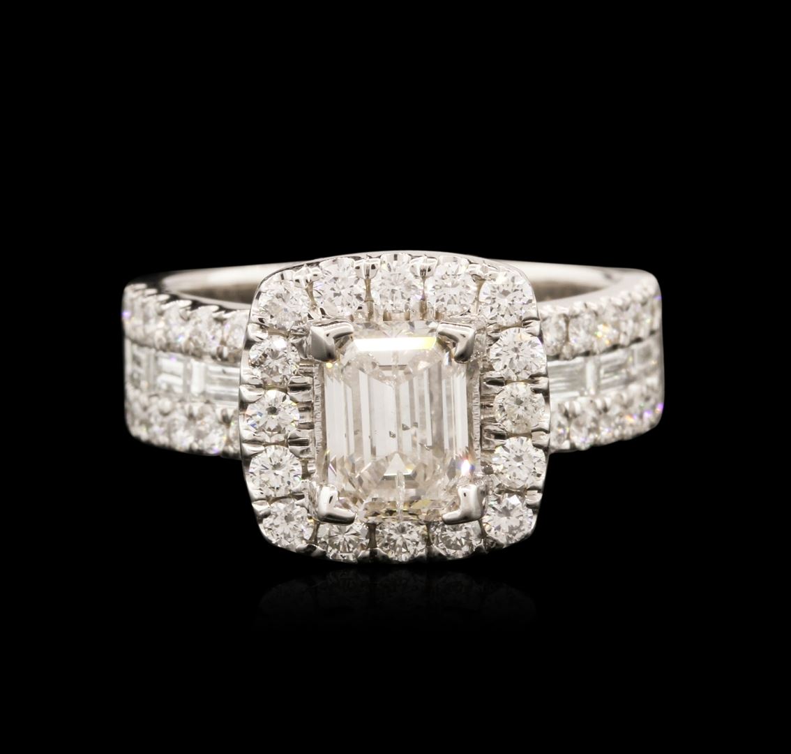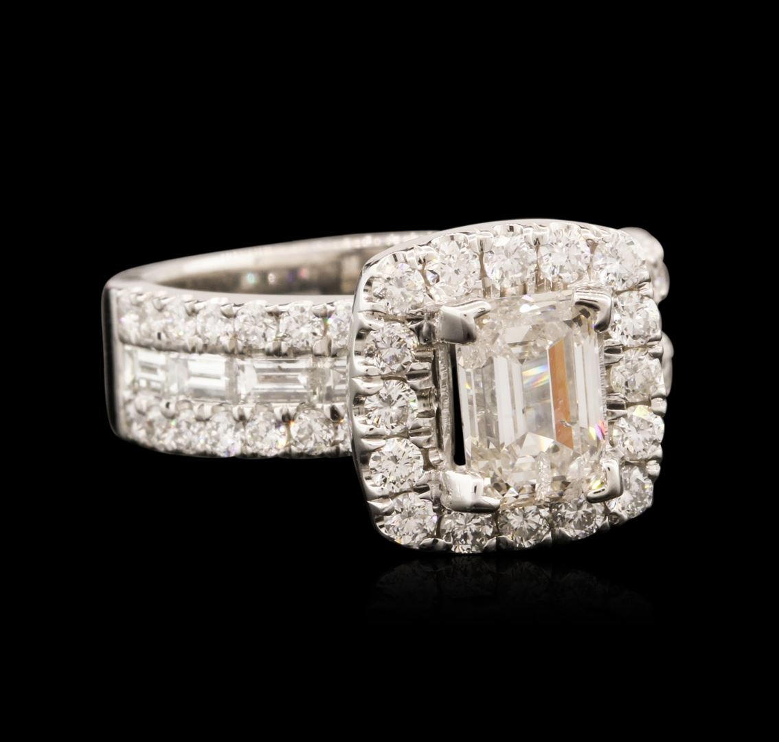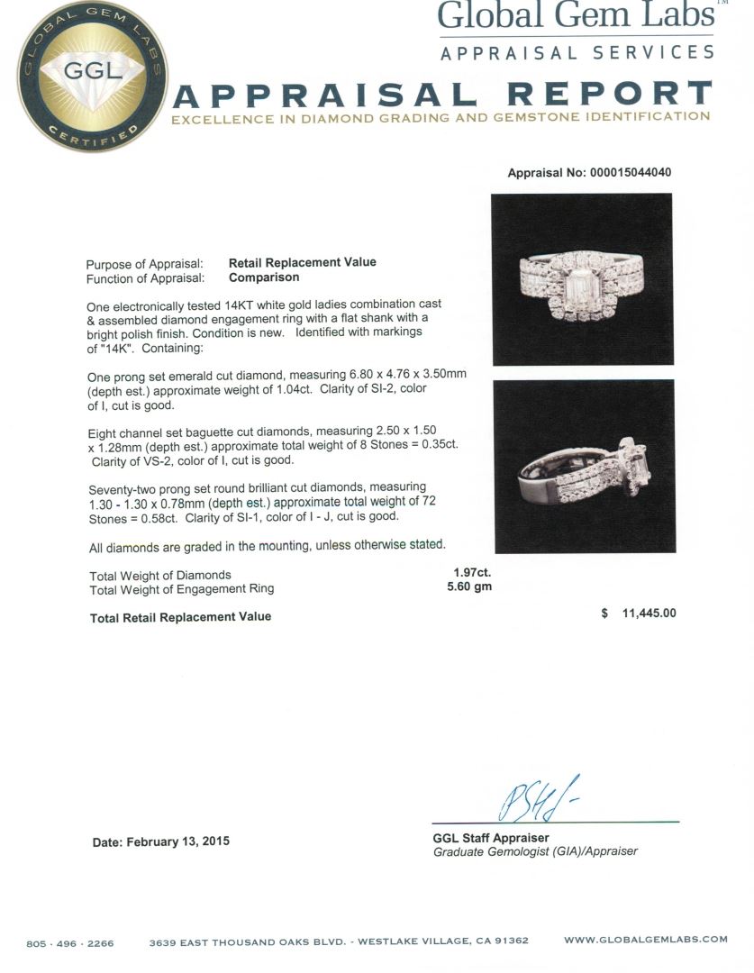 One electronically tested 14KT white gold ladies combination cast & assembled diamond engagement ring with a flat shank with a bright polish finish. Identified with markings of "14K". Condition is new. Containing: One prong set emerald cut diamond, measuring 6.80 x 4.76 x 3.50mm (depth est.) approximate weight of 1.04ct. Clarity: SI-2. Color: I, Cut is Good. Eight channel set baguette cut diamonds, measuring 2.50 x 1.50 x 1.28mm (depth est.) approximate total weight of 8 Stones = 0.35ct. Clarity: VS-2. Color: I, Cut is Good. Seventy-Two prong set round brilliant cut diamonds, measuring 1.30 - 1.30 x 0.78mm (depth est.) approximate total weight of 72 Stones = 0.58ct. Clarity: SI-1. Color: I - J, Cut is Good. All diamonds are graded in the mounting, unless otherwise stated. Total Weight of Diamonds 1.97ct. Total Weight of Engagement Ring 5.60 grams. GGL Appraised at $11,445.00.