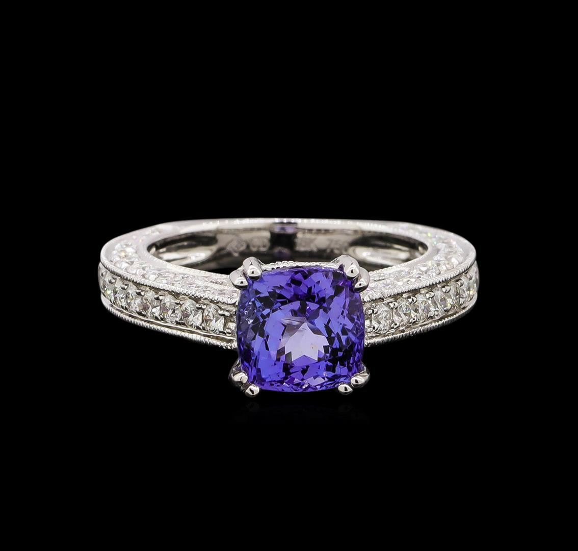 One electronically tested 14KT white gold ladies cast tanzanite and diamond ring with a bright polish finish. Identified with markings of "14K". Condition is new. Containing: One prong set square cushion modified brilliant cut natural tanzanite, measuring 7.50 x 7.58 x 4.43mm, approximate weight of 1.98ct., clarity is eye clean, type I, medium light, very slightly grayish, violet color, (GIA V 4/3), cut is good. One Hundred Six prong set round brilliant cut diamonds, measuring 1.80 - 1.00 x 0.84mm (depth est.) approximate total weight of 106 Stones = 1.06ct. Clarity: SI-1 to I-1. Color: I - J, Cut is Good. Colored gemstones are presumed to have been subjected to commonly used enhancement processes. All diamonds and colored gemstones are graded in the mounting, unless otherwise stated. Total Weight of Colored Stones 1.98ct. Total Weight of Diamonds 1.06ct. Total Weight of Ring 6.40 grams. GGL Appraised at $4,495.00.