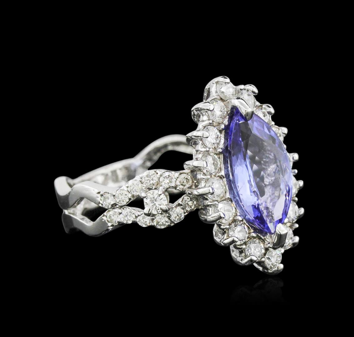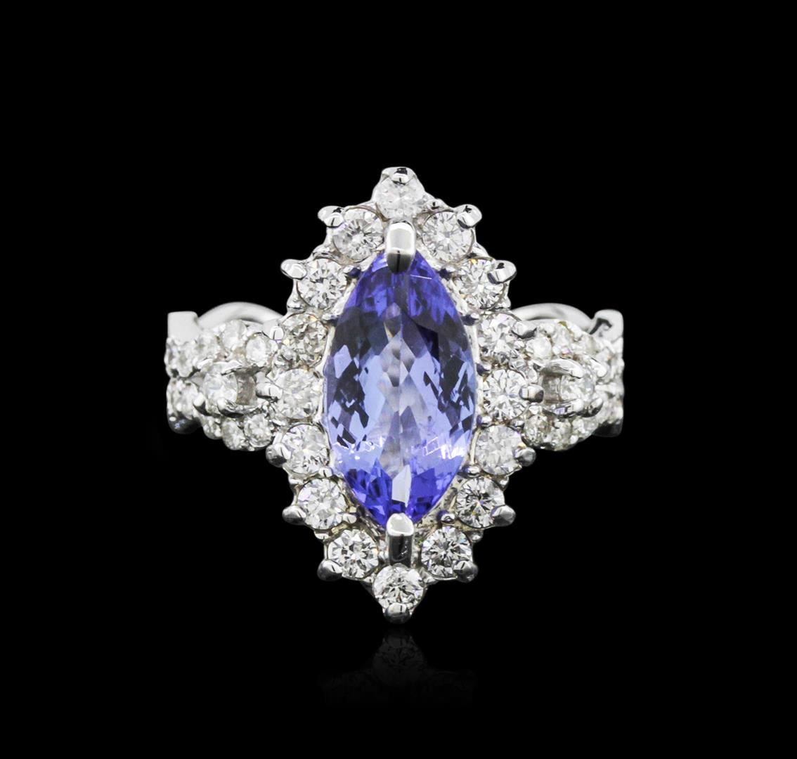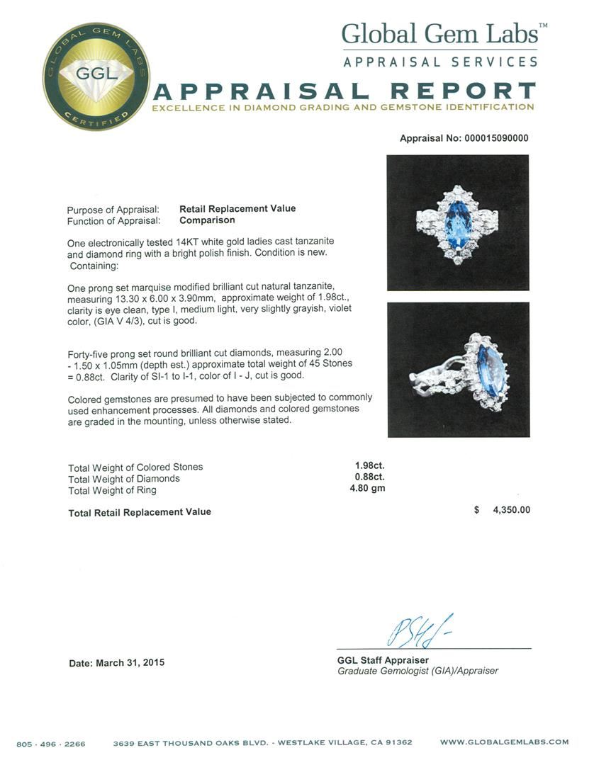 One electronically tested 14KT white gold ladies cast tanzanite and diamond ring with a bright polish finish. Condition is new. Containing: One prong set marquise modified brilliant cut natural tanzanite, measuring 13.30 x 6.00 x 3.90mm, approximate weight of 1.98ct., clarity is eye clean, type I, medium light, very slightly grayish, violet color, (GIA V 4/3), cut is good. Forty-Five prong set round brilliant cut diamonds, measuring 2.00 - 1.50 x 1.05mm (depth est.) approximate total weight of 45 Stones = 0.88ct. Clarity: SI-1 to I-1. Color: I - J, Cut is Good. Colored gemstones are presumed to have been subjected to commonly used enhancement processes. All diamonds and colored gemstones are graded in the mounting, unless otherwise stated. Total Weight of Colored Stones 1.98ct. Total Weight of Diamonds 0.88ct. Total Weight of Ring 4.80 grams. GGL Appraised at $4,350.00.