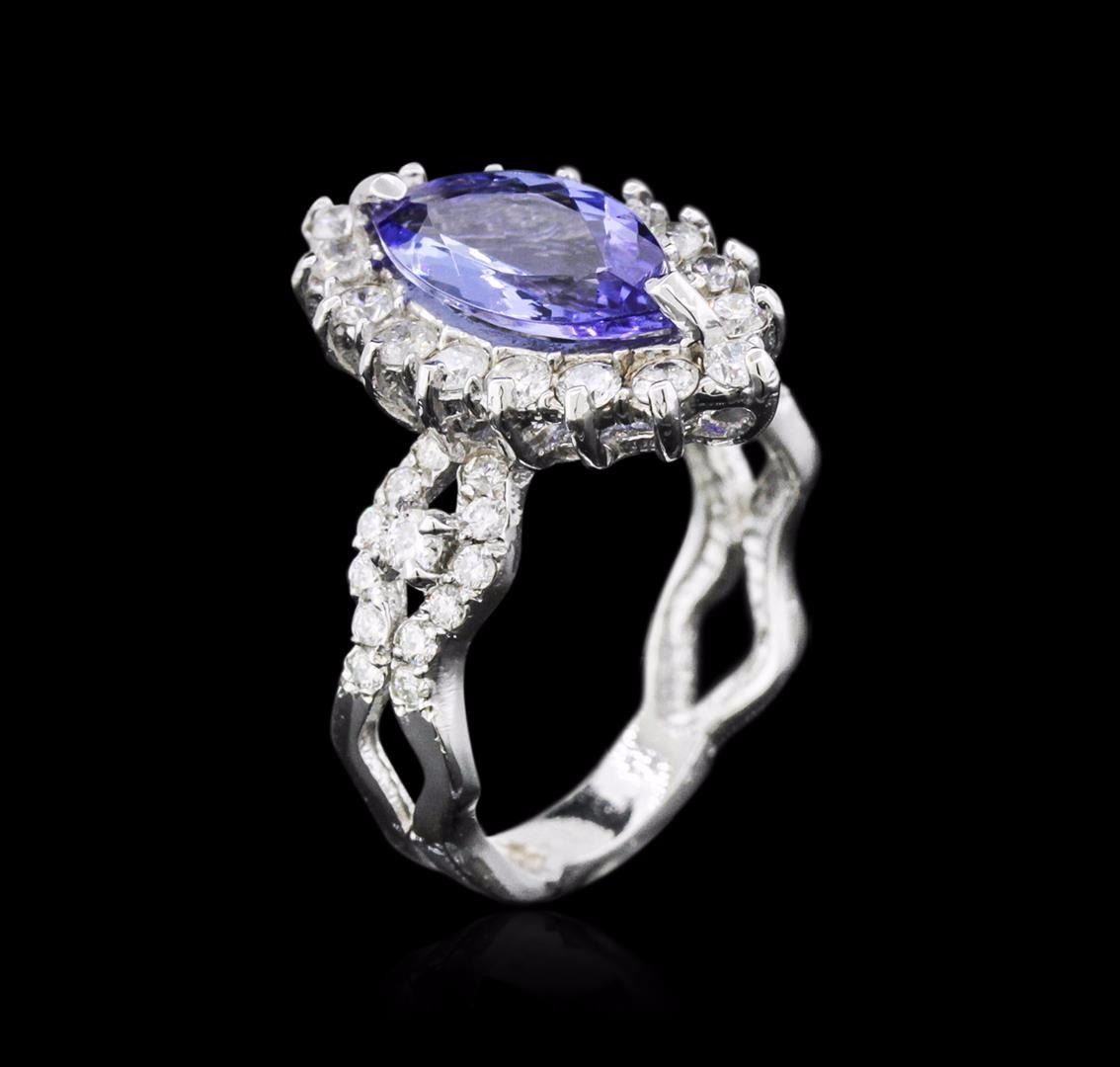 One electronically tested 14KT white gold ladies cast tanzanite and diamond ring with a bright polish finish. Condition is new. Containing: One prong set marquise modified brilliant cut natural tanzanite, measuring 13.30 x 6.00 x 3.90mm, approximate weight of 1.98ct., clarity is eye clean, type I, medium light, very slightly grayish, violet color, (GIA V 4/3), cut is good. Forty-Five prong set round brilliant cut diamonds, measuring 2.00 - 1.50 x 1.05mm (depth est.) approximate total weight of 45 Stones = 0.88ct. Clarity: SI-1 to I-1. Color: I - J, Cut is Good. Colored gemstones are presumed to have been subjected to commonly used enhancement processes. All diamonds and colored gemstones are graded in the mounting, unless otherwise stated. Total Weight of Colored Stones 1.98ct. Total Weight of Diamonds 0.88ct. Total Weight of Ring 4.80 grams. GGL Appraised at $4,350.00.