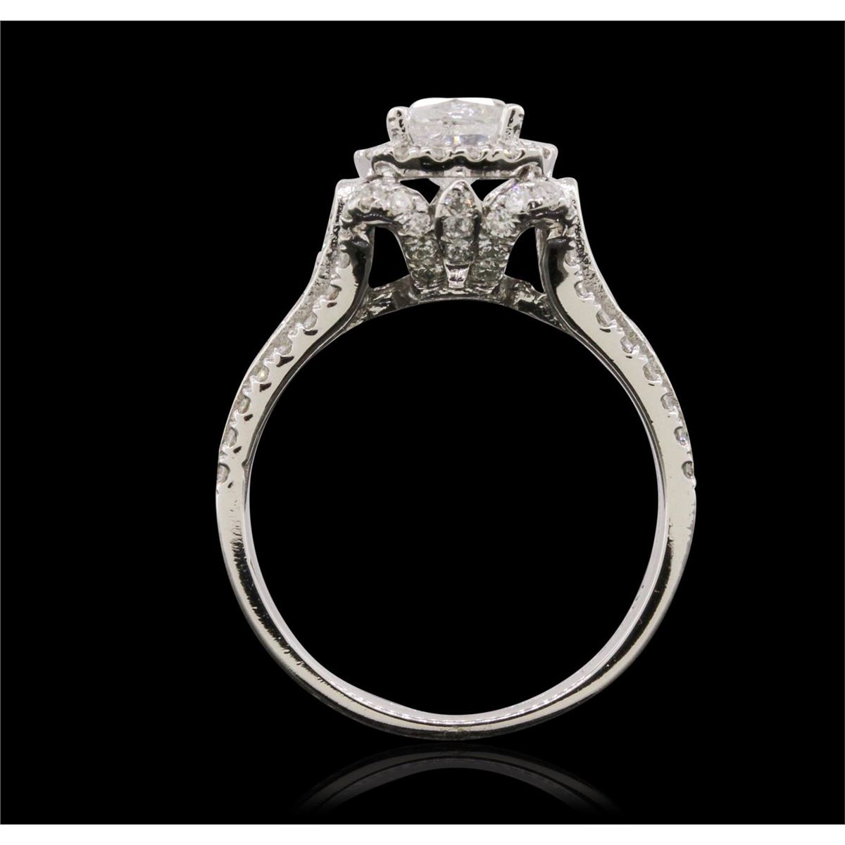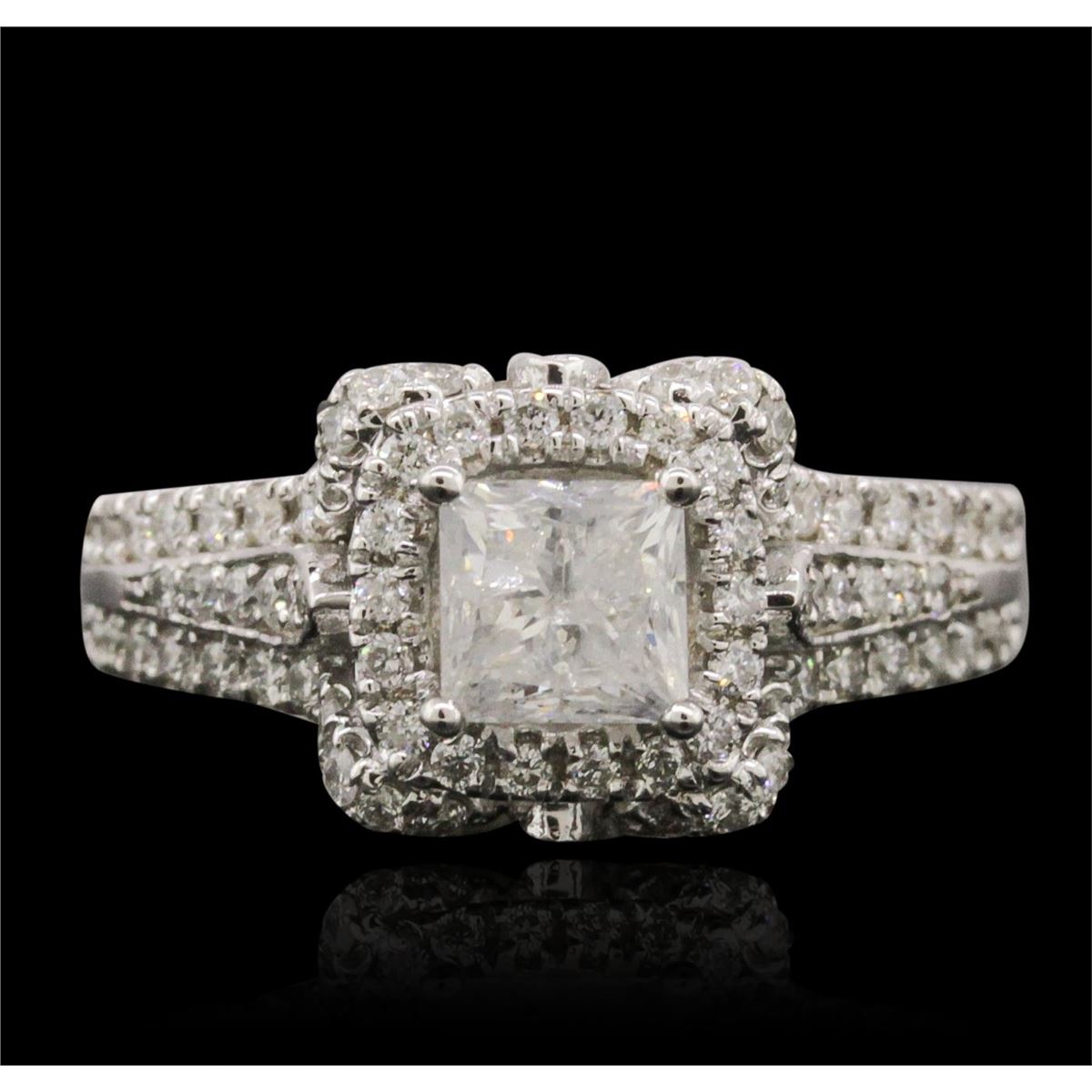 One electronically tested 14KT white gold ladies cast diamond unity ring with a bright polish finish. Condition is new, good workmanship. The featured diamond is set within a diamond bezel supported by an elaborate diamond set under gallery and diamond set shoulders, completed by a three millimeter wide band. Identified with markings of "K14". Containing: One prong set princess cut diamond, measuring 5.00 x 4.95 x 4.05mm (depth est.) approximate weight of 0.92ct. Graded in the setting. Clarity: I-2. Color: GDepth 81.8%. Table 70.7%. Ninety-Six prong set round brilliant cut diamonds, measuring 1.50 - 1.30 x 0.84mm (depth est.) approximate. Total Weight of 96 Stones = 1.06ct. Graded in the setting. Clarity: SI-1 to I-1. Color: G - I. Total Weight of Diamonds 1.98ct. Total Weight of Unity Ring 5.24gm. AIG Appraised at $10,100.00.