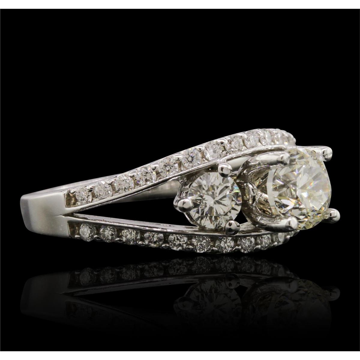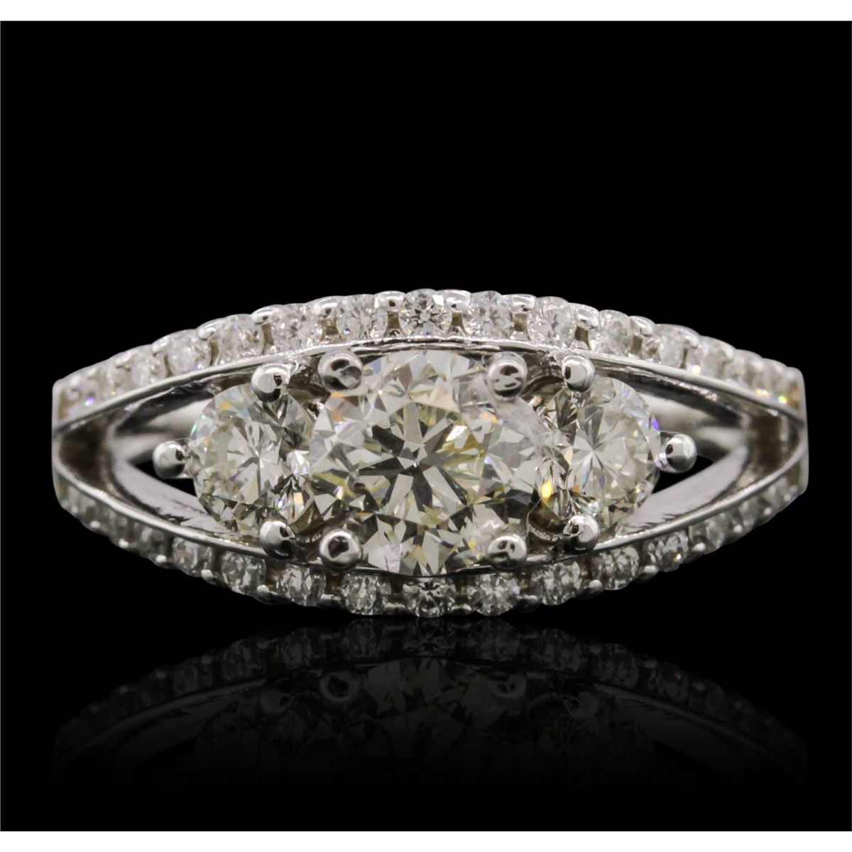 One electronically tested 14KT white gold Ladies combination cast & assembled engagement ring with a bright polish finish. Condition is new. Identified with markings of "14K". Containing: One prong set round brilliant cut diamond, measuring 5.92 - 5.87 x 3.64mm (depth est.) approximate. Total Weight of 1.01ct. Clarity: SI-3. Color: H, Cut is Good. Thirty-Four prong set round brilliant cut diamonds, measuring 1.30 - 1.30 x 0.78mm (depth est.) approximate. Total Weight of 34 Stones = 0.27ct. Clarity: SI-1 to SI-3. Color: F - H, Cut is Good. Two prong set round brilliant cut diamonds, measuring 4.60 - 4.60 x 2.76mm (depth est.) approximate. Total Weight of 2 Stones = 0.70ct. Clarity: SI-1 to SI-3. Color: H, Cut is Good. EGL USA GEM ID# US 911348436D. All diamonds are graded in the mounting, unless otherwise stated. Total Weight of Diamonds 1.98ct. Total Weight of Engagement Ring 5.70 grams. GGL Appraised at $23,225.00.