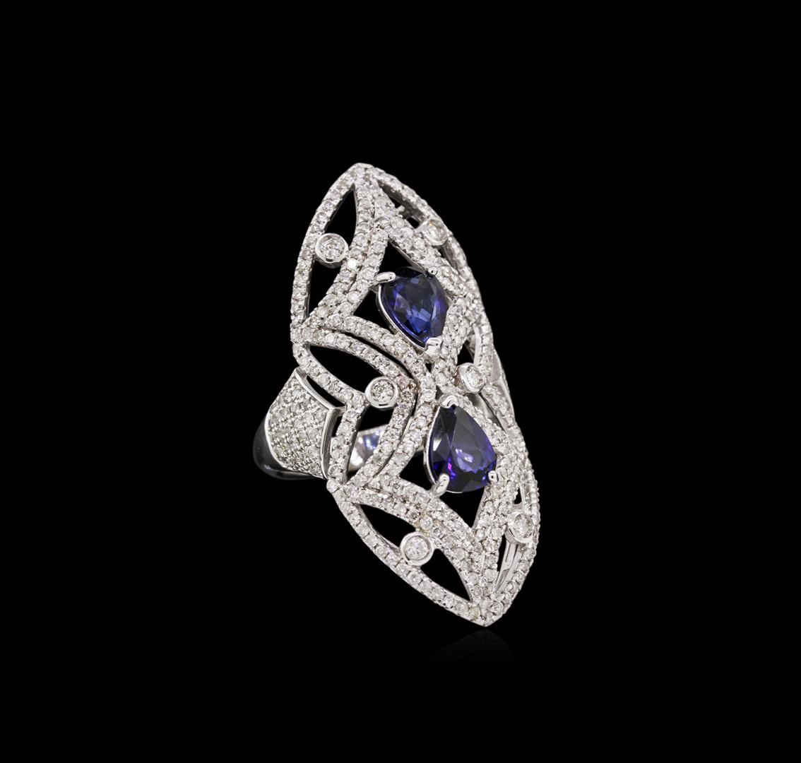 One electronically tested 14KT white gold ladies cast sapphire and diamond ring with a bright polish finish. The ring features two sapphire set within a mirroring diamond set lattice design supported by diamond set shoulders, completed by a three millimeter wide band. Identified with markings of "585". Condition is new, good workmanship. Containing: Two prong set pear mixed cut natural blue sapphires, measuring 7.30 x 5.20 x 3.10mm, approximate total weight of 1.98ct., clarity is slightly included, type II, dark, moderately strong, blue color, (GIA B 7/4), cut is good. Transmitting light with a minimum of distortion, transparent. Naturally occurring internal & external characteristics are present. Measurements & the color grade are an average for the group. Indications of laboratory high temperature diffusion treatment. Graded in the setting. Six bezel set round brilliant cut diamonds, measuring 2.10 - 2.00 x 1.23mm (depth est.) approximate total weight of 6 Stones = 0.24ct. Graded in the setting. Clarity: SI-2 to I-1. Color: G - H Two Hundred Fifty-Five prong set round brilliant cut diamonds, measuring 1.20 - 1.10 x 0.69mm (depth est.) approximate total weight of 255 Stones = 1.50ct. Graded in the setting. Clarity: I-1 to I-2. Color: G - I. Total Weight of Colored Stones 1.98ct. Total Weight of Diamonds 1.74ct. Total Weight of Ring 8.32 grams. AIG Appraised at $7,780.00.