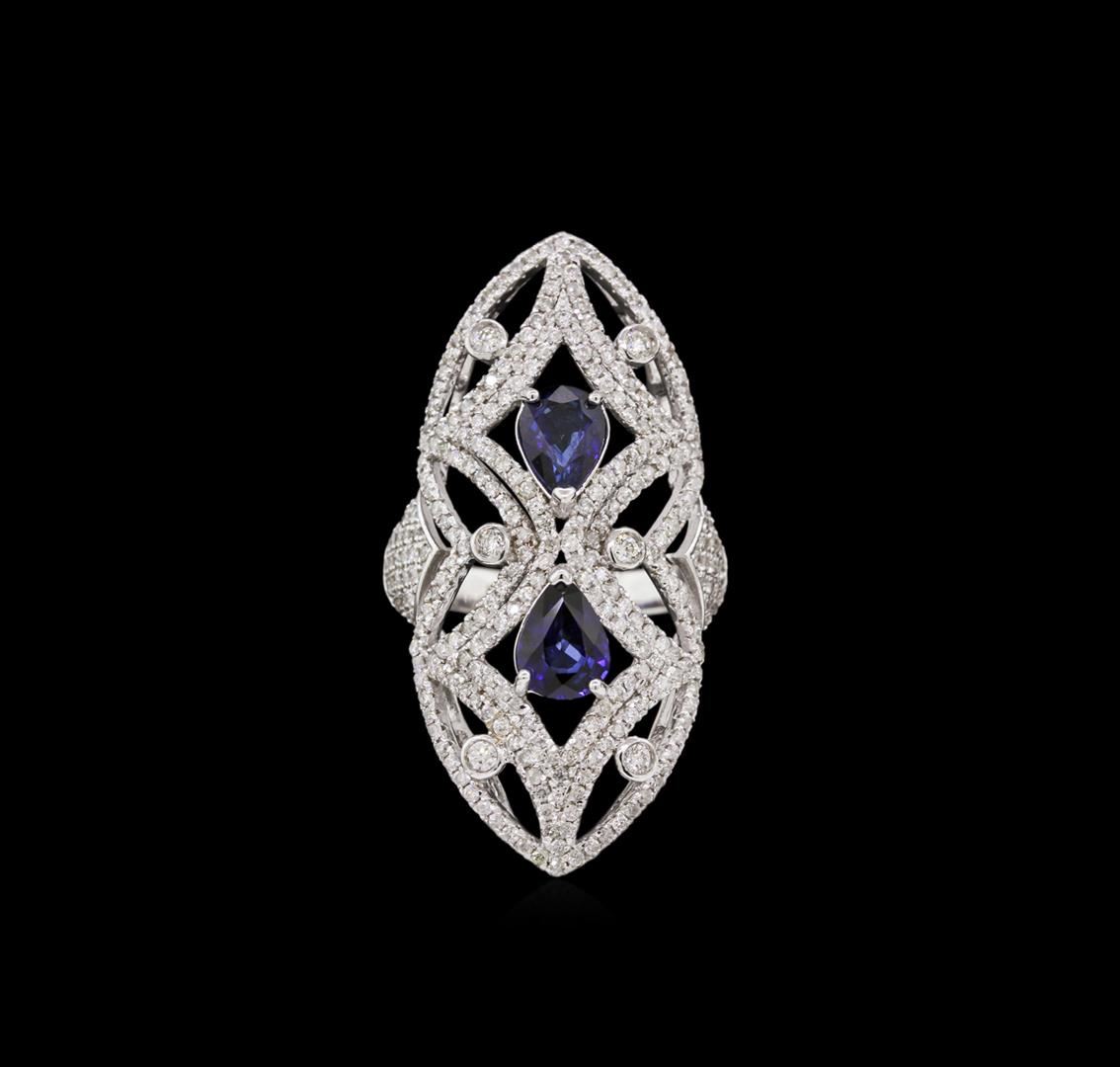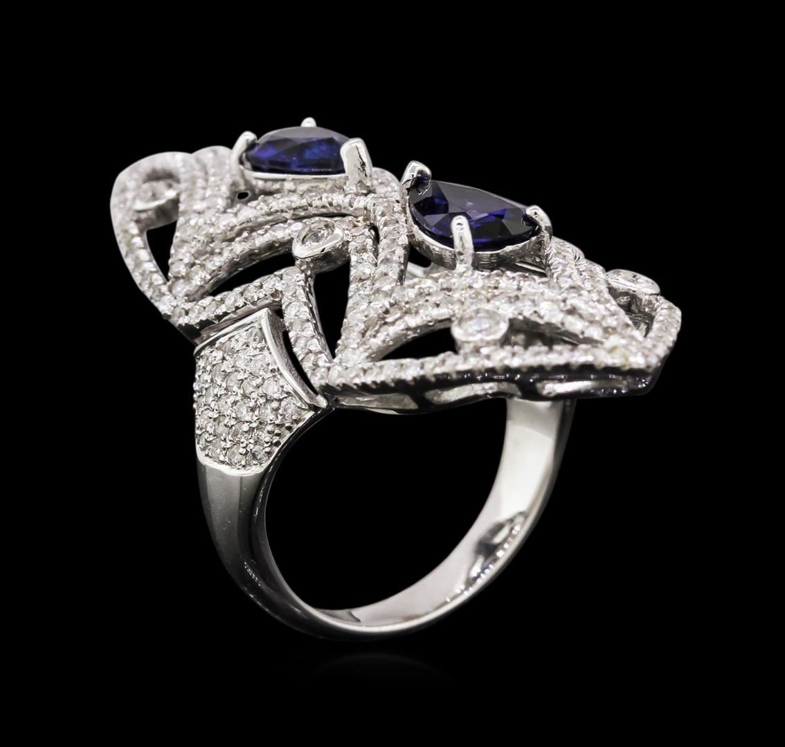 One electronically tested 14KT white gold ladies cast sapphire and diamond ring with a bright polish finish. The ring features two sapphire set within a mirroring diamond set lattice design supported by diamond set shoulders, completed by a three millimeter wide band. Identified with markings of "585". Condition is new, good workmanship. Containing: Two prong set pear mixed cut natural blue sapphires, measuring 7.30 x 5.20 x 3.10mm, approximate total weight of 1.98ct., clarity is slightly included, type II, dark, moderately strong, blue color, (GIA B 7/4), cut is good. Transmitting light with a minimum of distortion, transparent. Naturally occurring internal & external characteristics are present. Measurements & the color grade are an average for the group. Indications of laboratory high temperature diffusion treatment. Graded in the setting. Six bezel set round brilliant cut diamonds, measuring 2.10 - 2.00 x 1.23mm (depth est.) approximate total weight of 6 Stones = 0.24ct. Graded in the setting. Clarity: SI-2 to I-1. Color: G - H Two Hundred Fifty-Five prong set round brilliant cut diamonds, measuring 1.20 - 1.10 x 0.69mm (depth est.) approximate total weight of 255 Stones = 1.50ct. Graded in the setting. Clarity: I-1 to I-2. Color: G - I. Total Weight of Colored Stones 1.98ct. Total Weight of Diamonds 1.74ct. Total Weight of Ring 8.32 grams. AIG Appraised at $7,780.00.